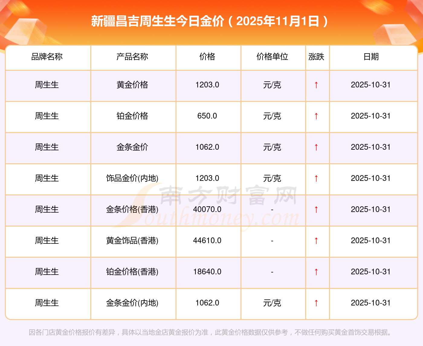 黄金价格1198.0元/克,铂金价格650.0元/克,饰品金价(内地)1198.0元/克,黄金饰品(香港)44660.0,铂金价格(香港)18640.0,金条价格(香港)40080.0,金条金价(内地)1058.0元/克,黄金价格1200.0元/克,铂金价格560.0元/克,足金价格1200.0元/克,黄金价格1135.0元/克。