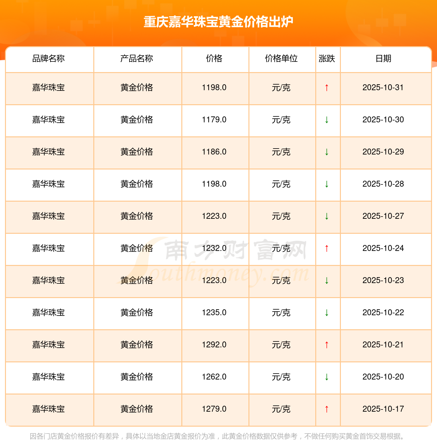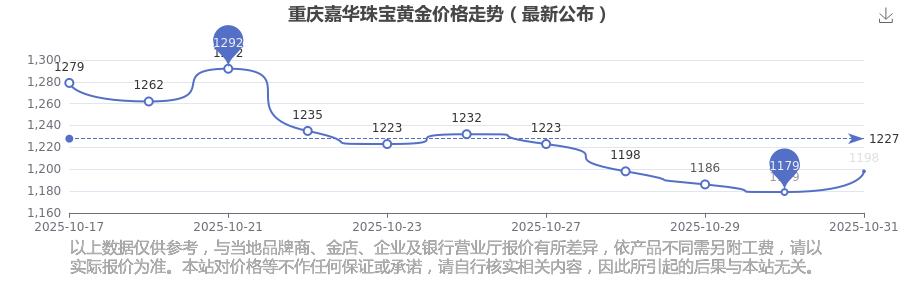 今日重庆嘉华珠宝黄金价格查询,2025年11月1日,今日重庆嘉华珠宝黄金价格:1198.0元/克。
