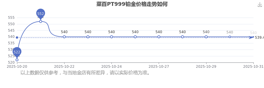 今日菜百 PT999铂金价格,最新确定为540.0元/克。