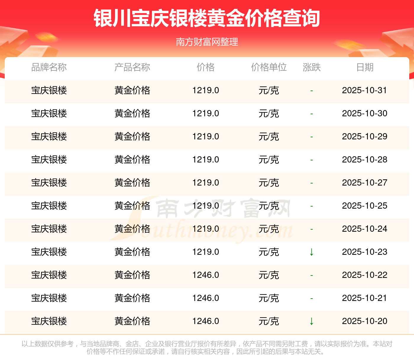 今日(2025年11月1日),银川宝庆银楼黄金价格的定价为 1219.0元/克。