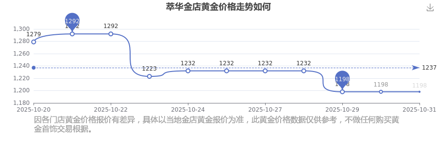 最新数据表明,萃华金店今日 黄金价格为1198.0元/克。
