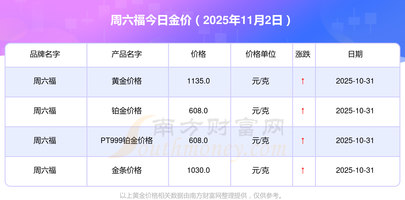 2025年11月2日周大福、周大福、周大福、周大福、周大福、周大福、周大福、老凤祥、老凤祥、老凤祥、周六福等各大金店品牌黄金价格最新价格如下:周大福黄金价格1198.0元/克,周大福铂金价格650.0元/克,周大福饰品金价(内地)1198.0元/克,周大福黄金饰品(香港)44660.0,周大福铂金价格(香港)18640.0,周大福金条价格(香港)40080.0,周大福金条金价(内地)1058.0元/克,老凤祥黄金价格1200.0元/克,老凤祥铂金价格560.0元/克,老凤祥足金价格1200.0元/克,周六福黄金价格1135.0元/克。