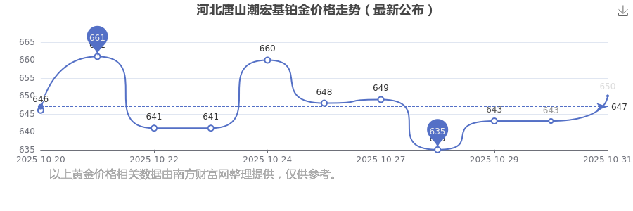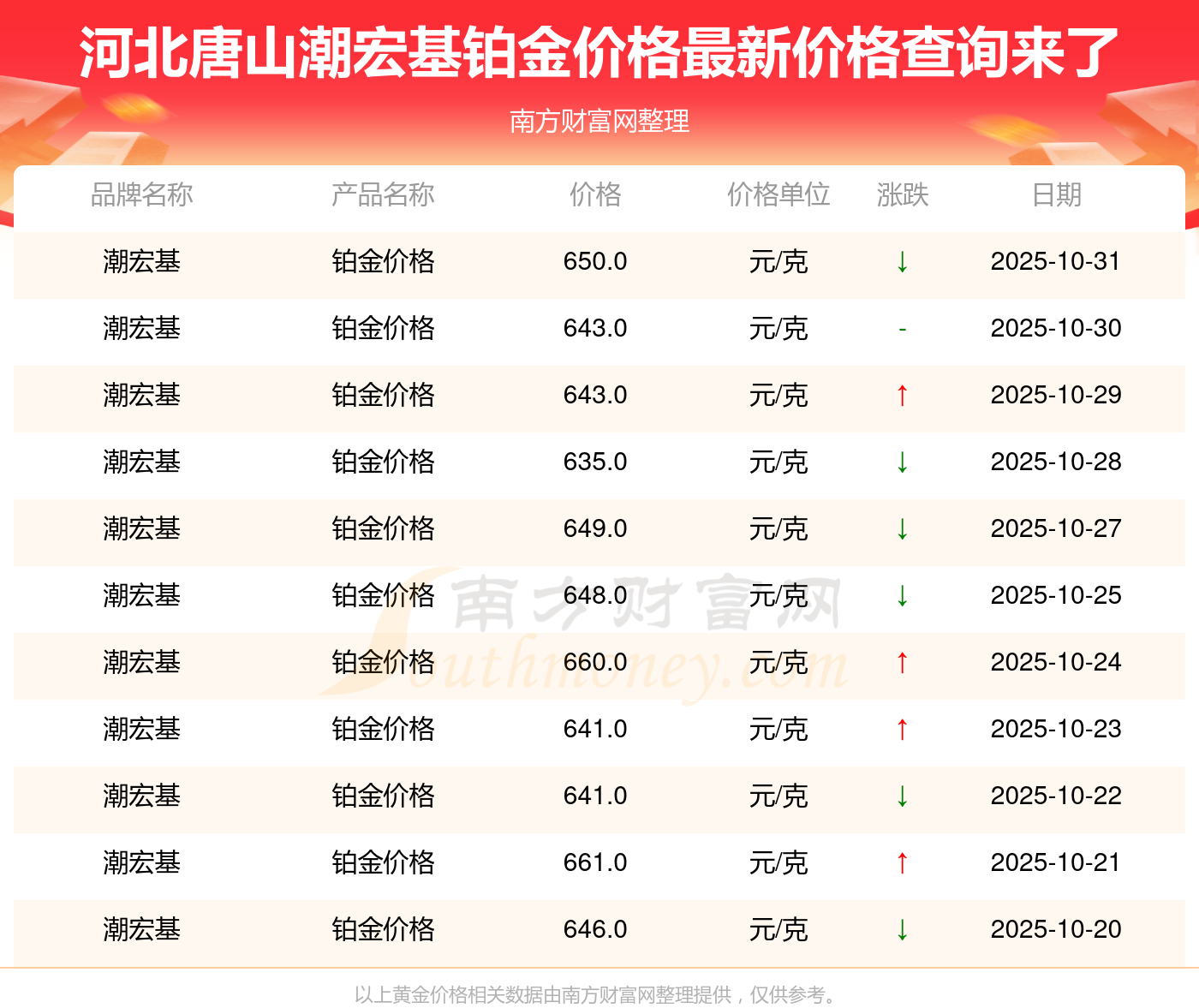 河北唐山潮宏基在 2025年11月2日的铂金价格零售价格为 650.0元/克。