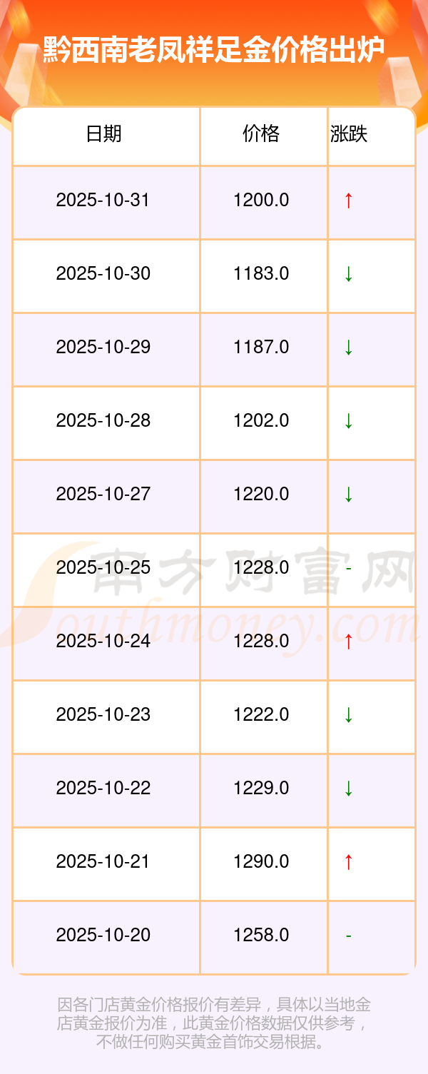 2025年11月2日黔西南老凤祥足金价格为1200.0元/克。