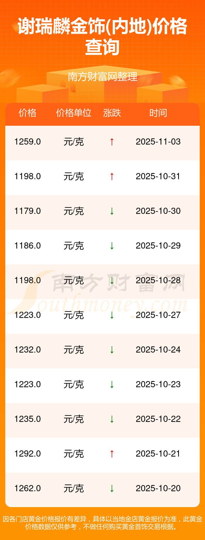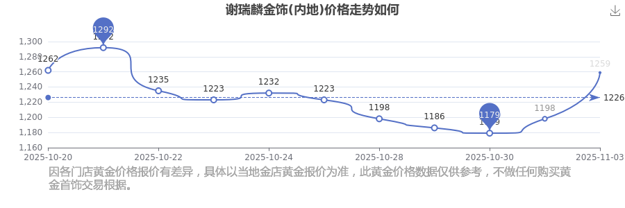 今日谢瑞麟 金饰(内地)价格,最新确定为1259.0元/克。
