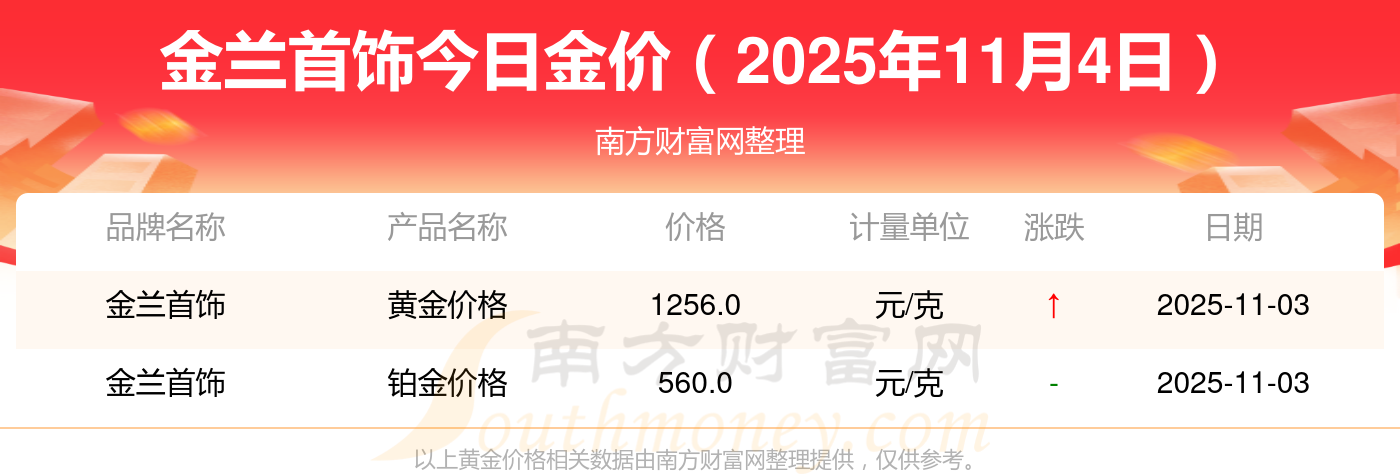 2025年11月4日金兰首饰金价查询:金条金价(内地)1120.0元/克,黄金价格1256.0元/克,铂金价格560.0元/克,足金价格1256.0元/克,黄金价格1120.0元/克,铂金价格596.0元/克,PT999铂金价格596.0元/克,金条价格1015.0元/克,黄金价格1259.0元/克,金条金价(内地)1120.0元/克,铂金价格635.0元/克。