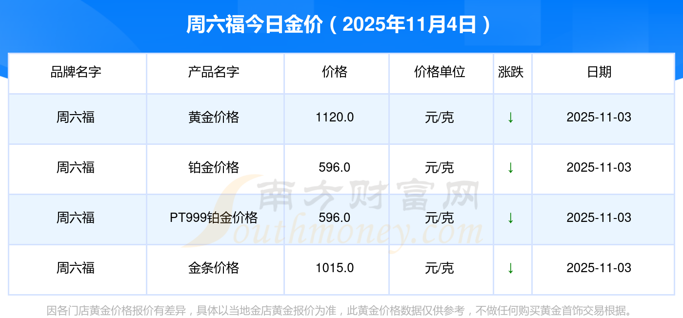 周六福今日黄金价格行情如何:金条金价(内地)1120.0元/克,黄金价格1256.0元/克,铂金价格560.0元/克,足金价格1256.0元/克,黄金价格1120.0元/克,铂金价格596.0元/克,PT999铂金价格596.0元/克,金条价格1015.0元/克,黄金价格1259.0元/克,金条金价(内地)1120.0元/克,铂金价格635.0元/克。