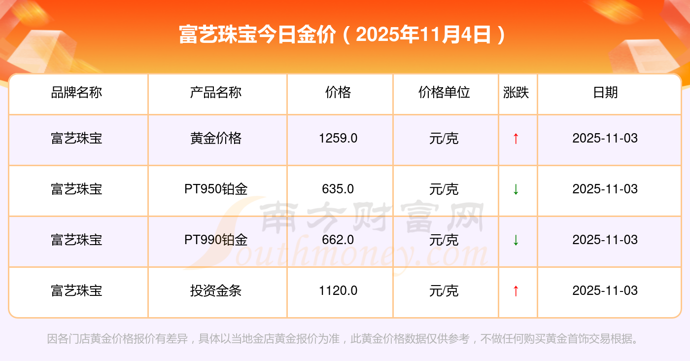 现在富艺珠宝黄金价格是多少钱1克_2025年富艺珠宝今日金价是多少钱一克,最新富艺珠宝查询,2025年11月4日富艺珠宝黄金价格现在每克多少钱?最新富艺珠宝黄金价格报价公布,一起来看看吧!