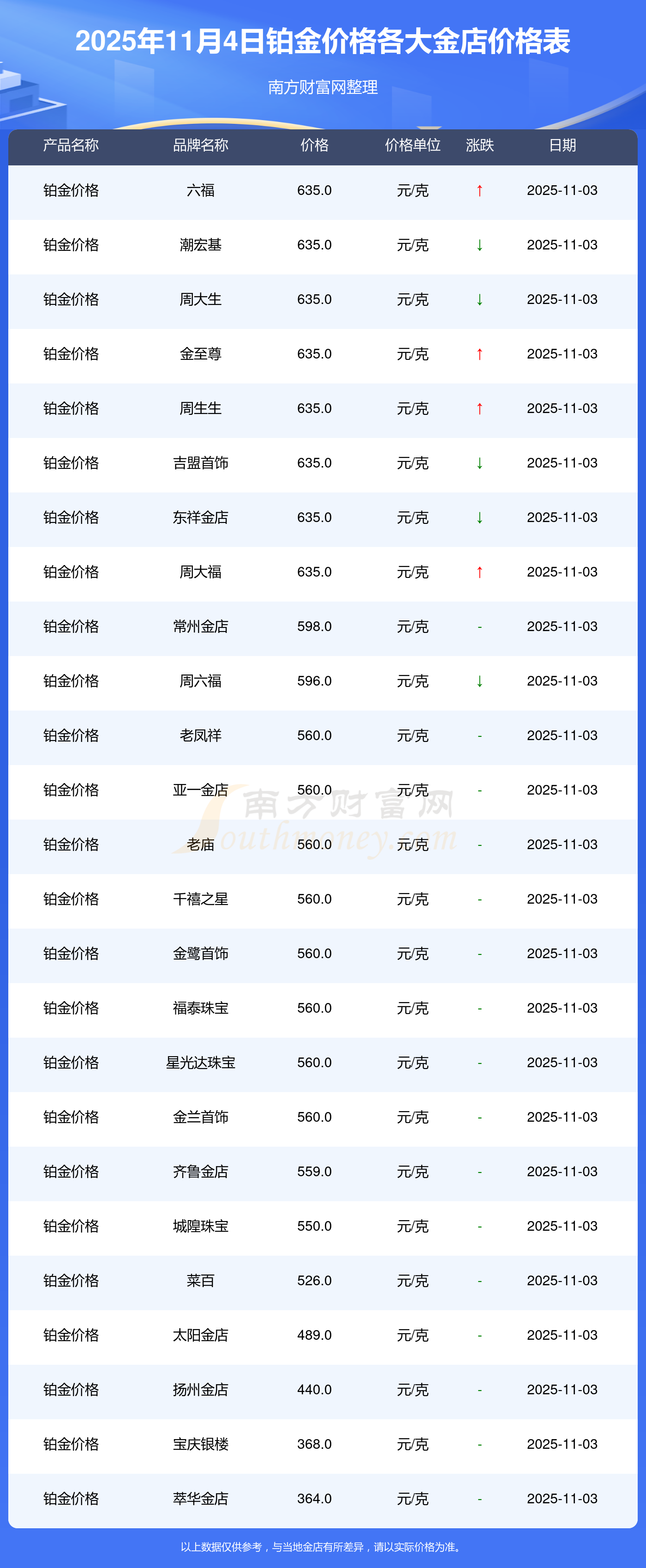 各大金店铂金价格最新价格公布,2025年11月4日各大金店铂金价格多少钱一克?