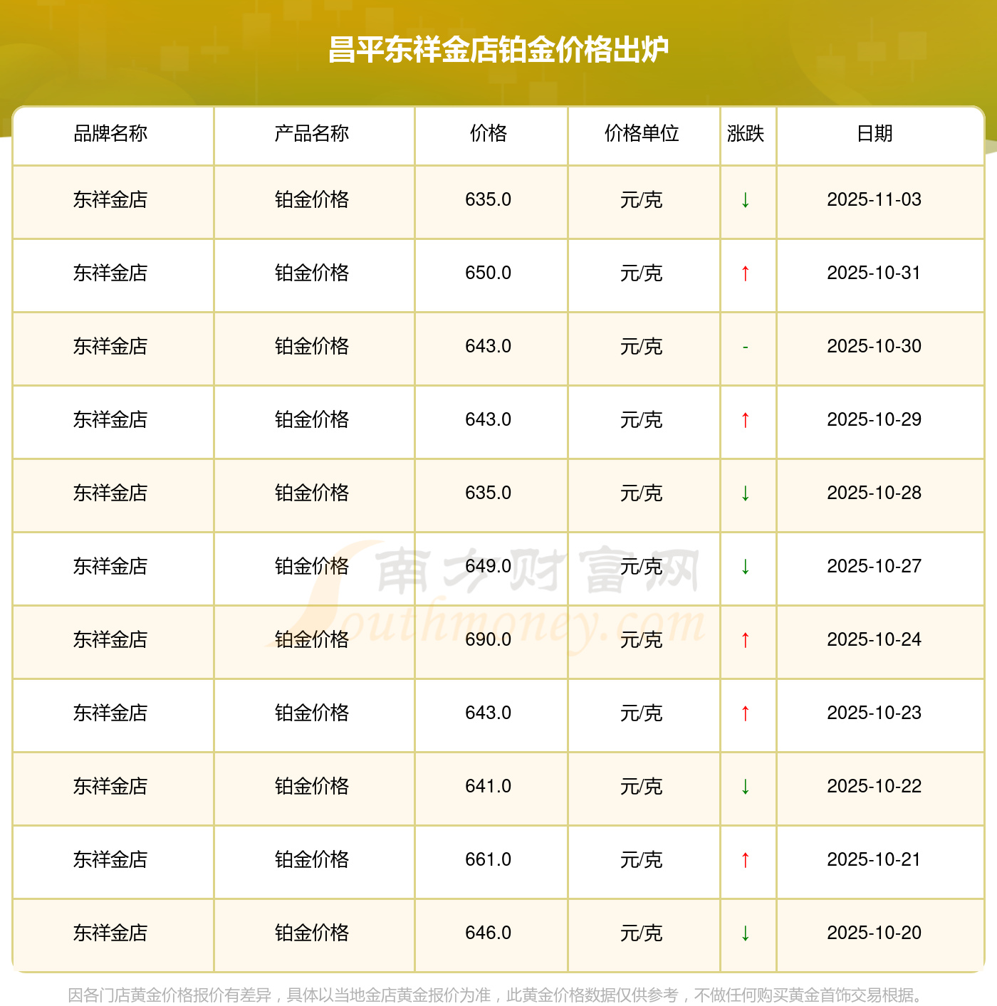 今天是2025年11月4日,周大福、老凤祥、老凤祥、老凤祥、周六福、周六福、周六福、周六福、六福、六福、六福等各大金店品牌铂金价格最新价格如下:周大福1120.0元/克、老凤祥1256.0元/克、老凤祥560.0元/克、老凤祥1256.0元/克、周六福1120.0元/克、周六福596.0元/克、周六福596.0元/克、周六福1015.0元/克、六福1259.0元/克、六福1120.0元/克、六福635.0元/克。