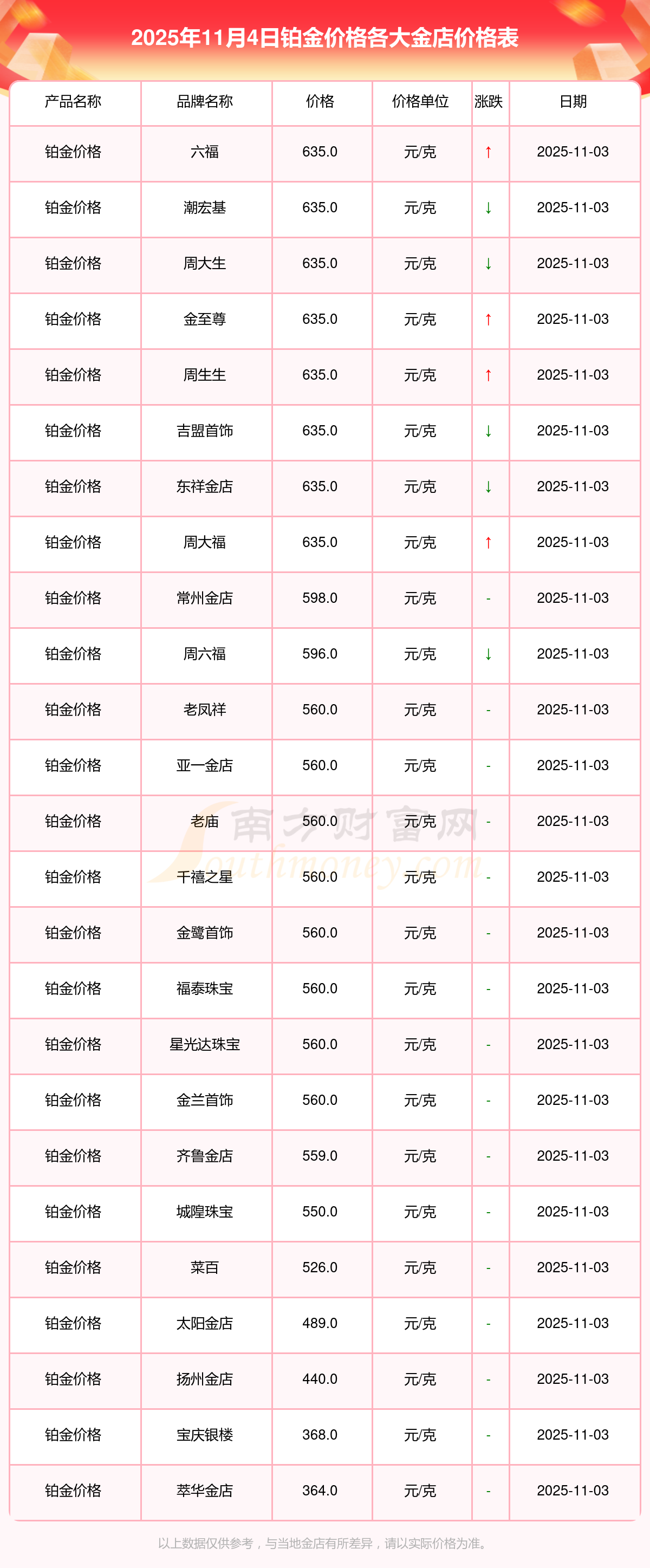 2025年11月4日,周大福、老凤祥、老凤祥、老凤祥、周六福、周六福、周六福、周六福、六福、六福、六福等各大金店品牌铂金价格今日价格如下:周大福1120.0元/克、老凤祥1256.0元/克、老凤祥560.0元/克、老凤祥1256.0元/克、周六福1120.0元/克、周六福596.0元/克、周六福596.0元/克、周六福1015.0元/克、六福1259.0元/克、六福1120.0元/克、六福635.0元/克。