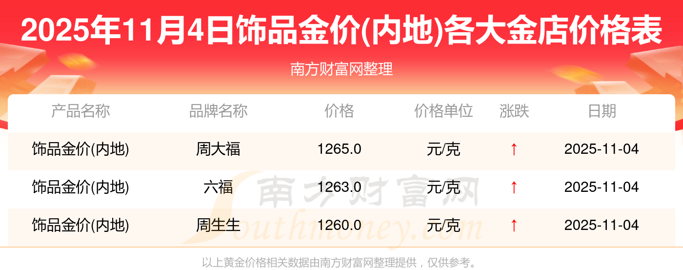 2025年11月4日,周大福、周大福、周大福、周大福、周大福、周大福、周大福、老凤祥、老凤祥、老凤祥、周六福等各大金店品牌饰品金价(内地)今日价格如下:周大福1265.0元/克、周大福633.0元/克、周大福1265.0元/克、周大福44220.0、周大福18130.0、周大福39890.0、周大福1168.0元/克、老凤祥1262.0元/克、老凤祥560.0元/克、老凤祥1262.0元/克、周六福1209.0元/克。