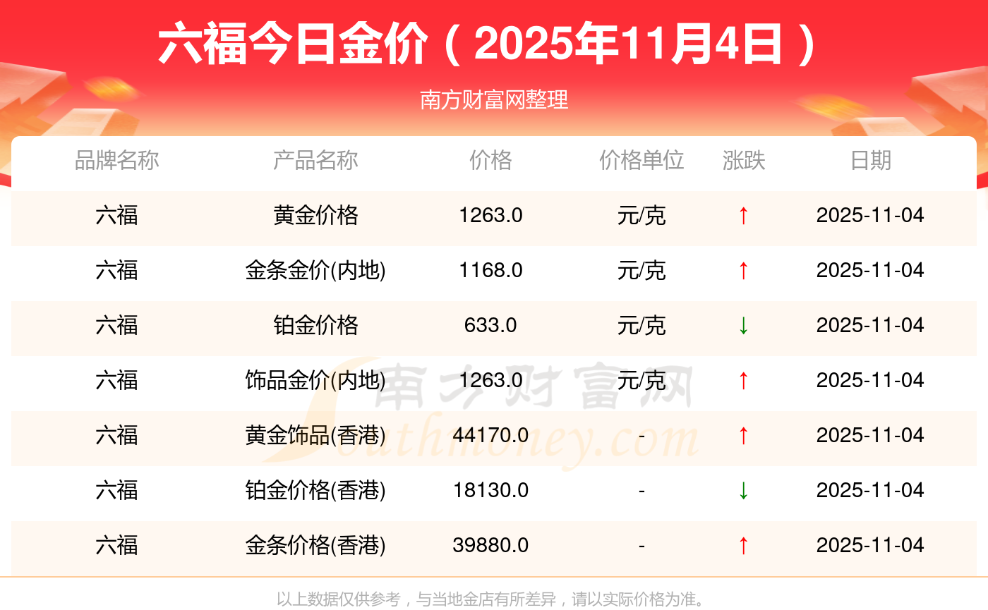六福今日黄金价格行情如何:黄金价格1265.0元/克,铂金价格633.0元/克,饰品金价(内地)1265.0元/克,黄金饰品(香港)44220.0,铂金价格(香港)18130.0,金条价格(香港)39890.0,金条金价(内地)1168.0元/克,黄金价格1262.0元/克,铂金价格560.0元/克,足金价格1262.0元/克,黄金价格1209.0元/克。