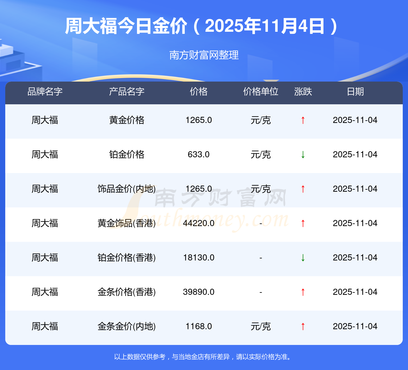 2025年11月4日周大福最新价格:黄金价格1265.0元/克,铂金价格633.0元/克,饰品金价(内地)1265.0元/克,黄金饰品(香港)44220.0,铂金价格(香港)18130.0,金条价格(香港)39890.0,金条金价(内地)1168.0元/克,黄金价格1262.0元/克,铂金价格560.0元/克,足金价格1262.0元/克,黄金价格1209.0元/克。