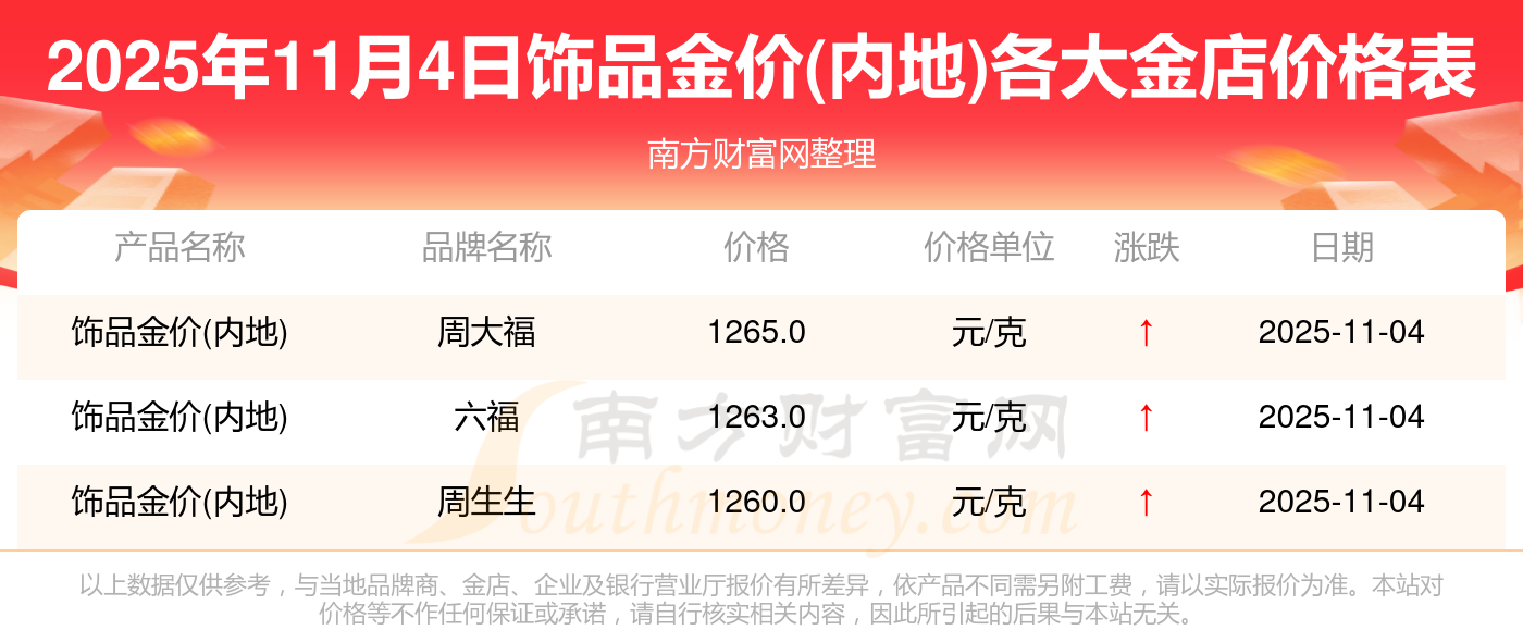 2025年11月4日周大福、周大福、周大福、周大福、周大福、周大福、周大福、老凤祥、老凤祥、老凤祥、周六福等各大金店品牌饰品金价(内地)最新价格如下:周大福黄金价格1265.0元/克,周大福铂金价格633.0元/克,周大福饰品金价(内地)1265.0元/克,周大福黄金饰品(香港)44220.0,周大福铂金价格(香港)18130.0,周大福金条价格(香港)39890.0,周大福金条金价(内地)1168.0元/克,老凤祥黄金价格1262.0元/克,老凤祥铂金价格560.0元/克,老凤祥足金价格1262.0元/克,周六福黄金价格1209.0元/克。