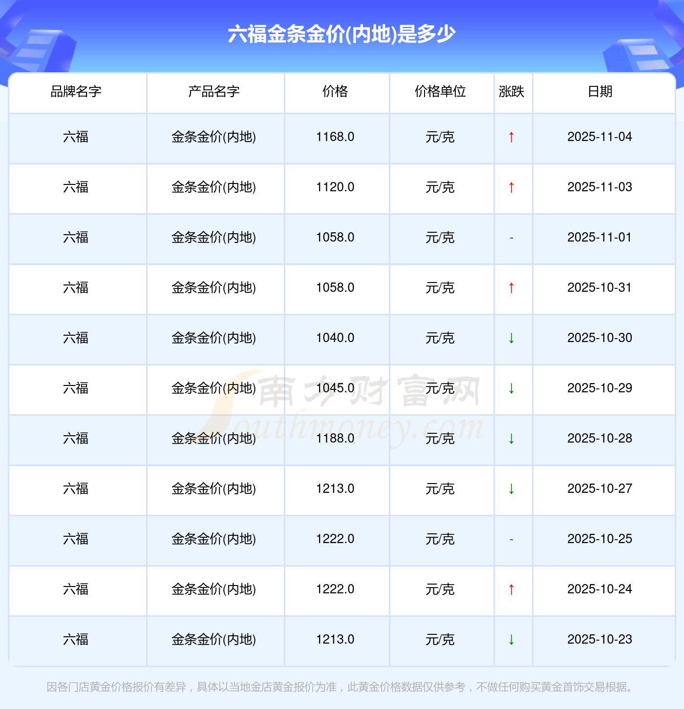 以上数据仅供参考,与当地品牌商、金店、企业及银行营业厅报价有所差异,依产品不同需另附工费,请以实际报价为准。本站对价格等不作任何保证或承诺,请自行核实相关内容,因此所引起的后果与本站无关。
