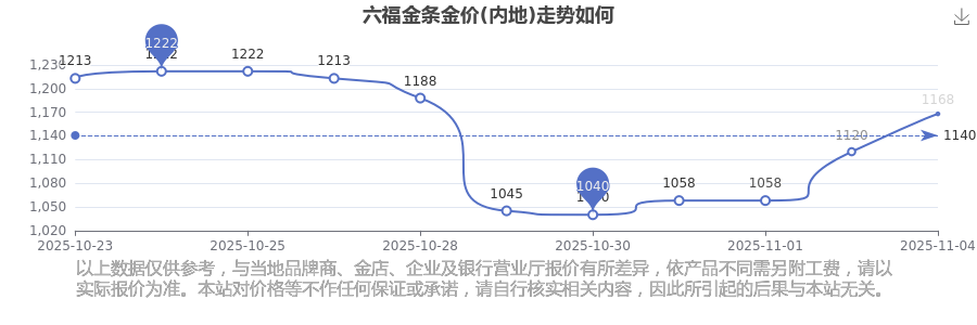 六福今日金条金价(内地)的最新标价为1168.0元/克。