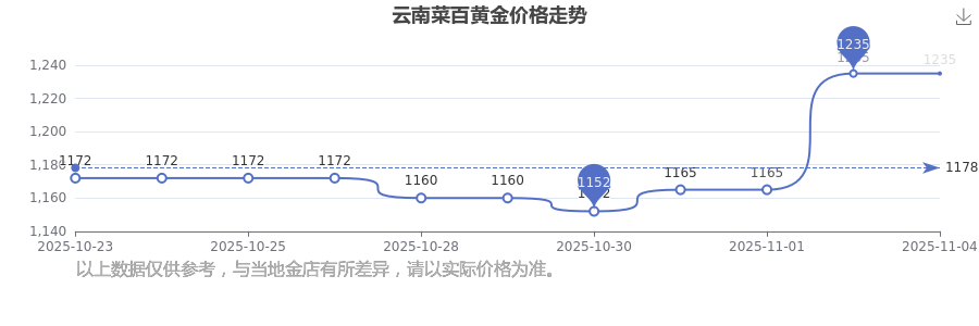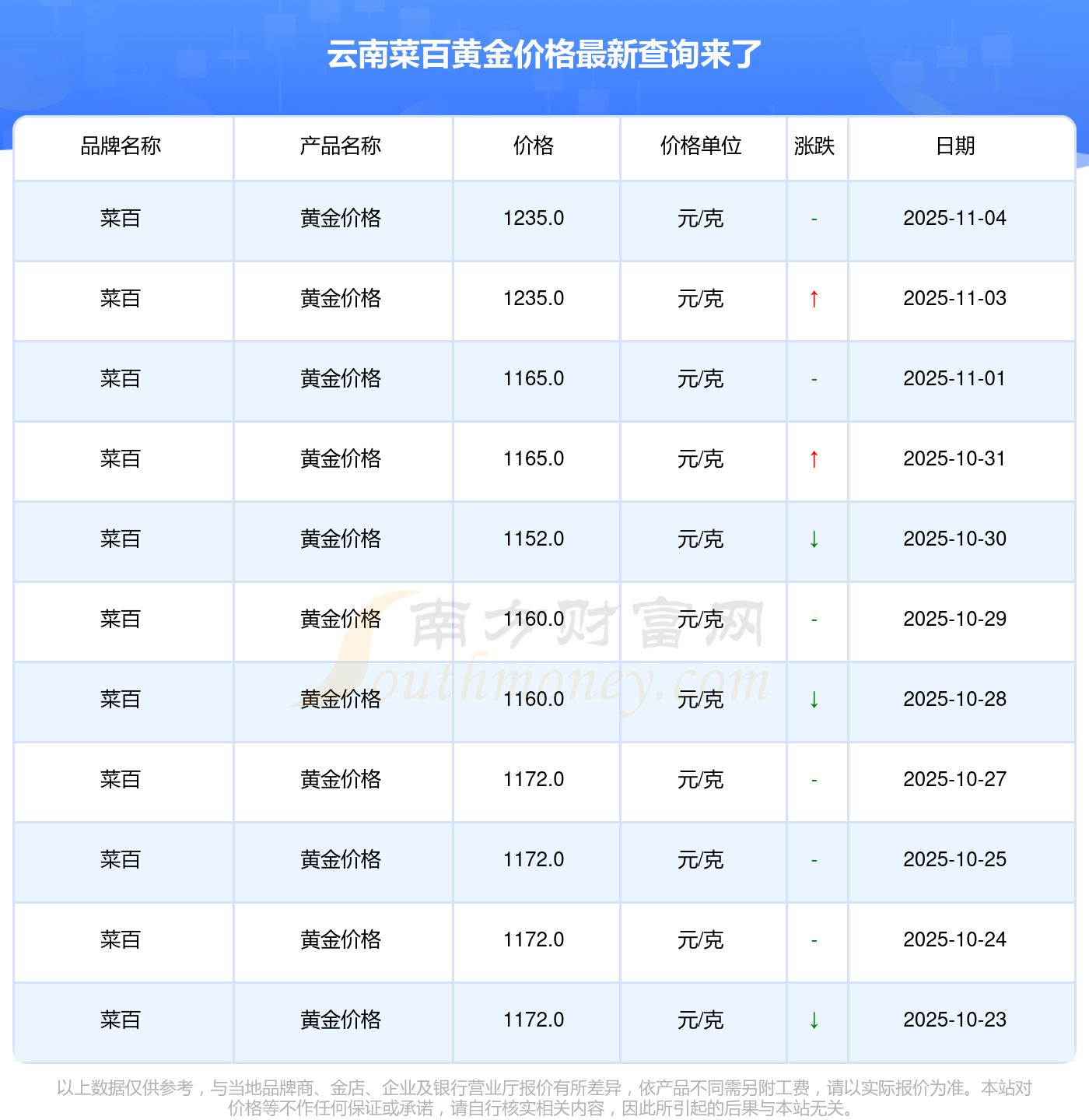 今日(2025年11月4日),1235.0元/克是云南菜百黄金价格的价格标准。