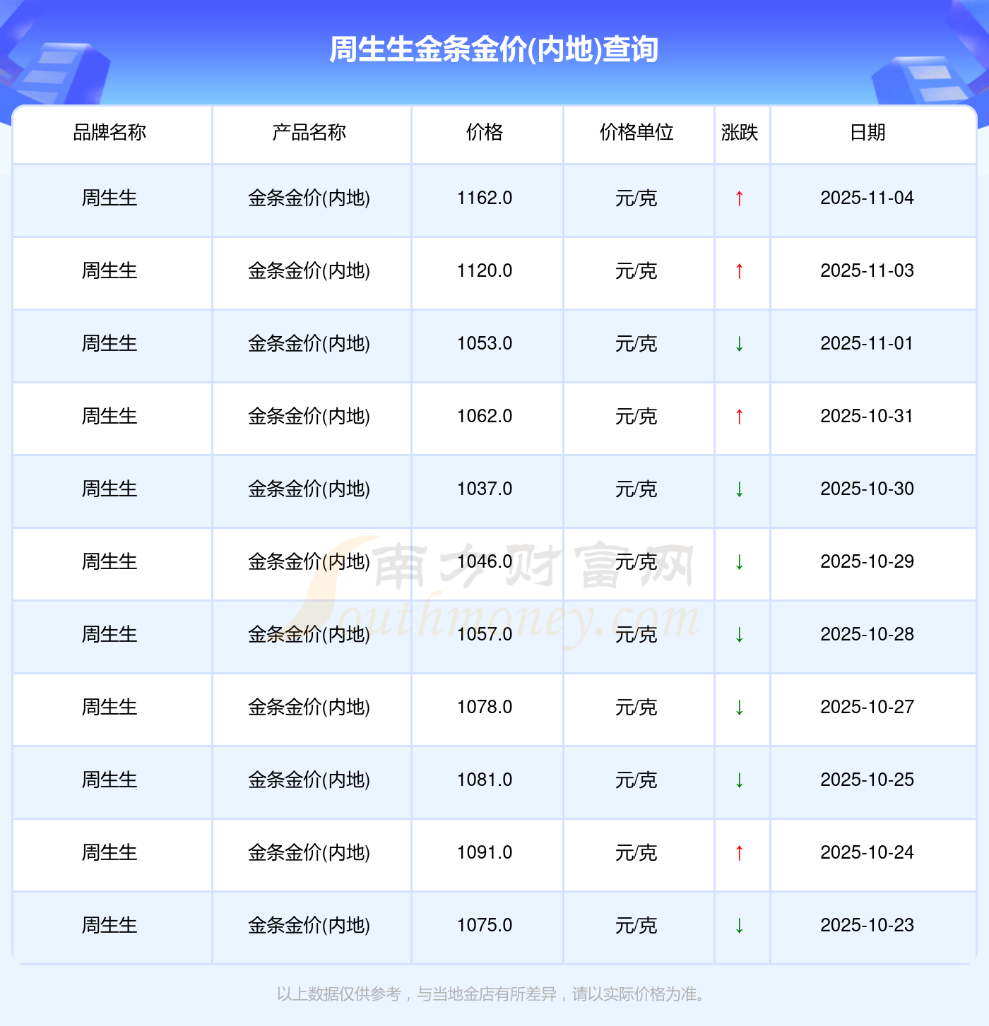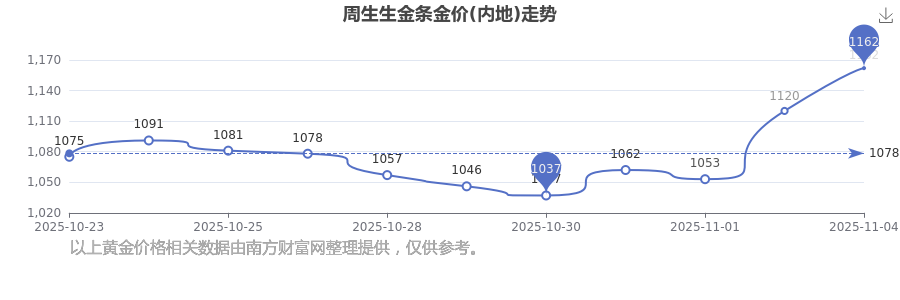 今日(2025年11月4日),周生生金条金价(内地):1162.0元/克。