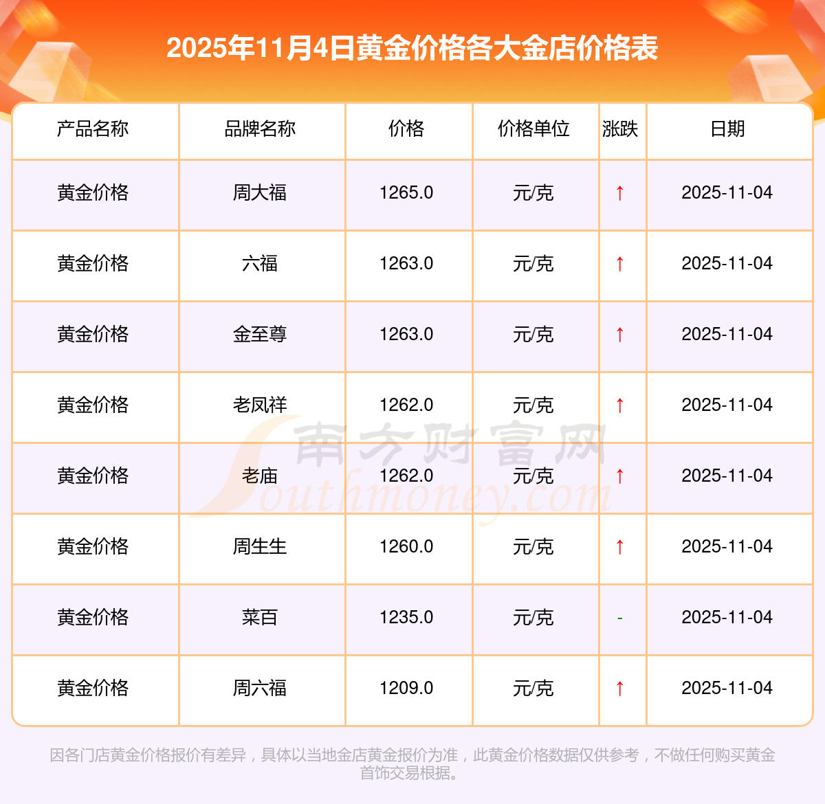 2025年11月4日各大金店黄金价格最新价格:周大福1265.0元/克,周大福633.0元/克,周大福1265.0元/克,周大福44220.0,周大福18130.0,周大福39890.0,周大福1168.0元/克,老凤祥1262.0元/克,老凤祥560.0元/克,老凤祥1262.0元/克,周六福1209.0元/克。