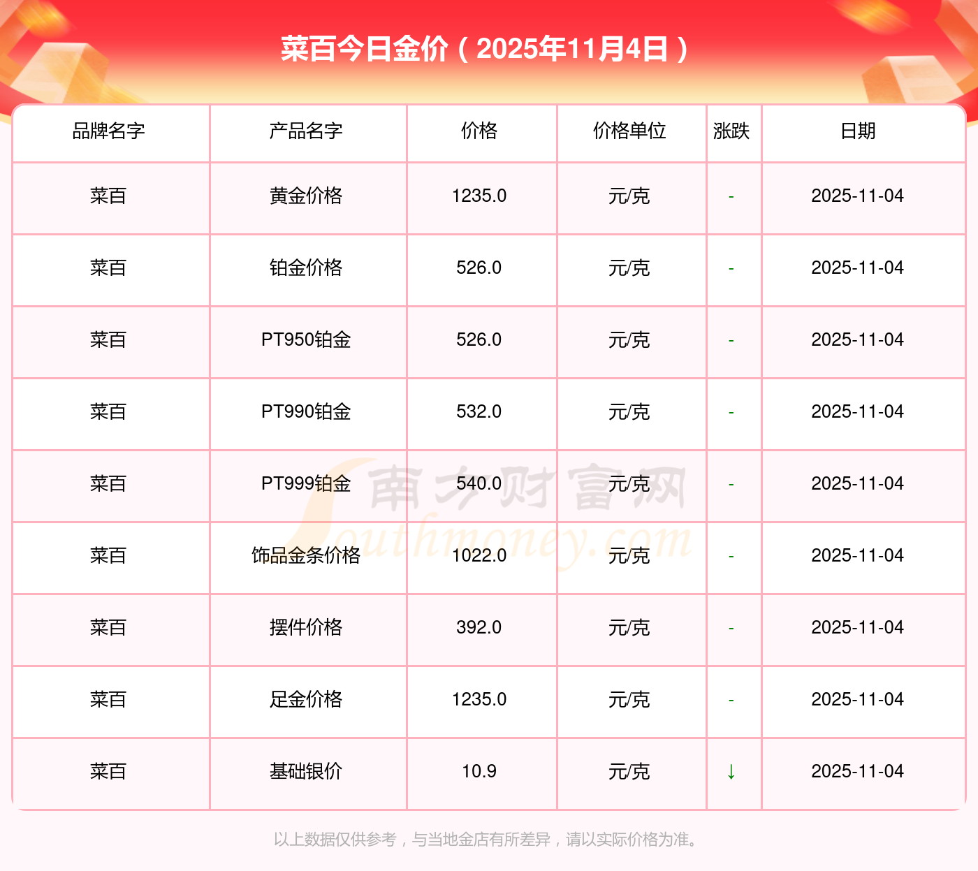 2025年11月4日菜百最新价格:黄金价格1265.0元/克,铂金价格633.0元/克,饰品金价(内地)1265.0元/克,黄金饰品(香港)44220.0,铂金价格(香港)18130.0,金条价格(香港)39890.0,金条金价(内地)1168.0元/克,黄金价格1262.0元/克,铂金价格560.0元/克,足金价格1262.0元/克,黄金价格1209.0元/克。