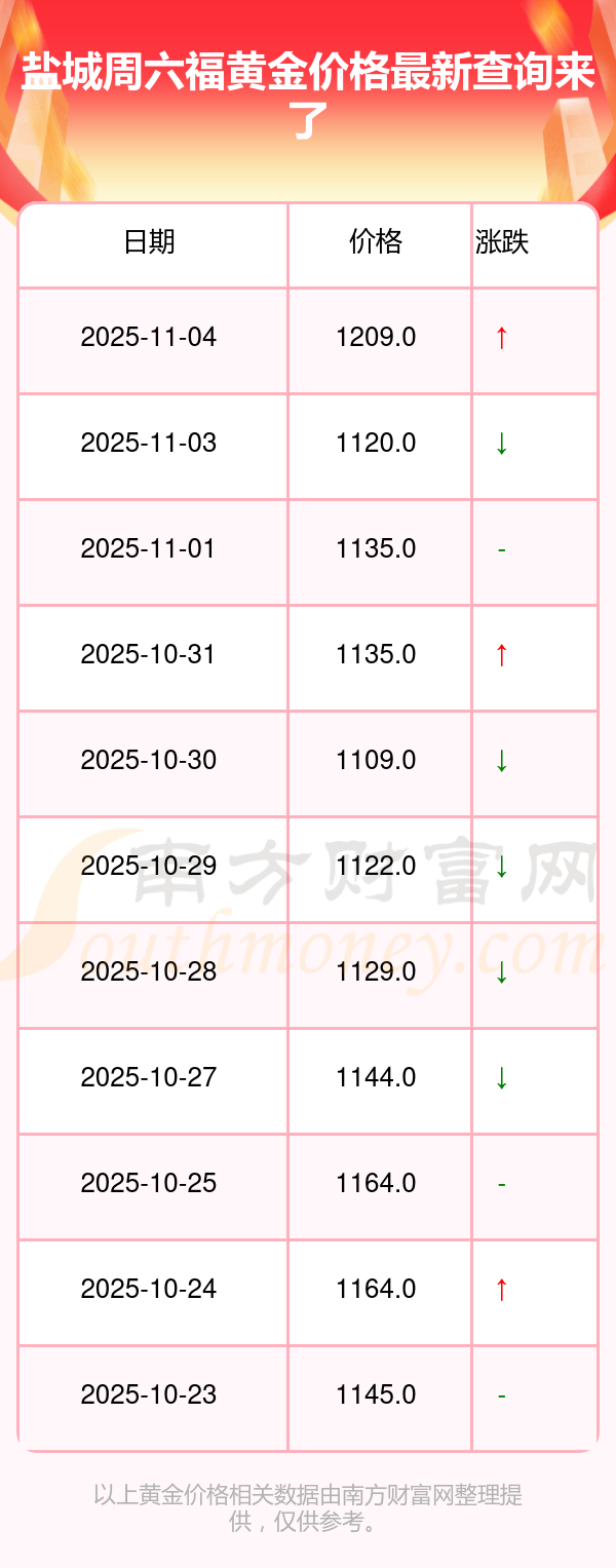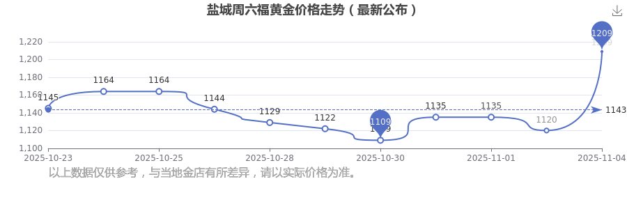 盐城周六福黄金价格在 2025年11月4日,其市场价格为 1209.0元/克。