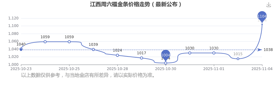 作为 2004 年创立的品牌,周六福积极探索民族文化和现代潮流文化,融合古典与现代的精髓,以美学设计搭配现代工艺,打造出年轻化、时尚化、个性化的珠宝,截止 2022 年,周六福在全国的品牌门店有 4000 家,销售网点遍布全国不同地区。江西周六福今日金条价格多少一克,2025年11月4日周六福金条价格一览表,随小编来了解一下详情。
