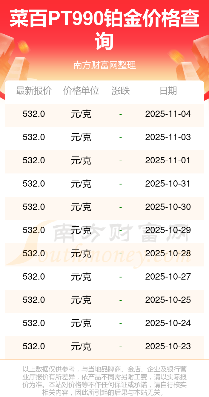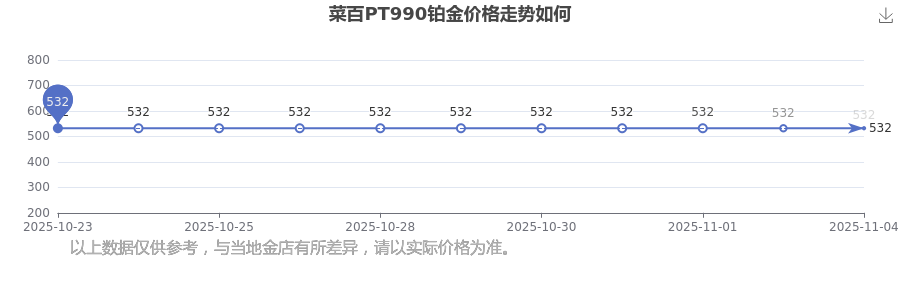 目前菜百 PT990铂金的价格,今日最新为532.0元/克。