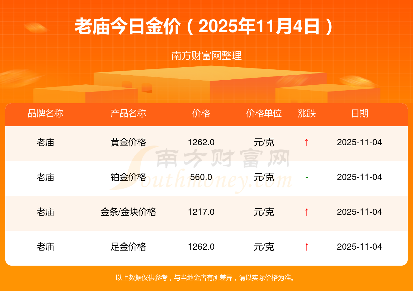 现在老庙黄金价格是多少钱1克_2025年老庙今日金价是多少钱一克,最新老庙查询,2025年11月4日老庙足金价格现在每克多少钱?最新老庙足金价格报价公布,一起来看看吧!