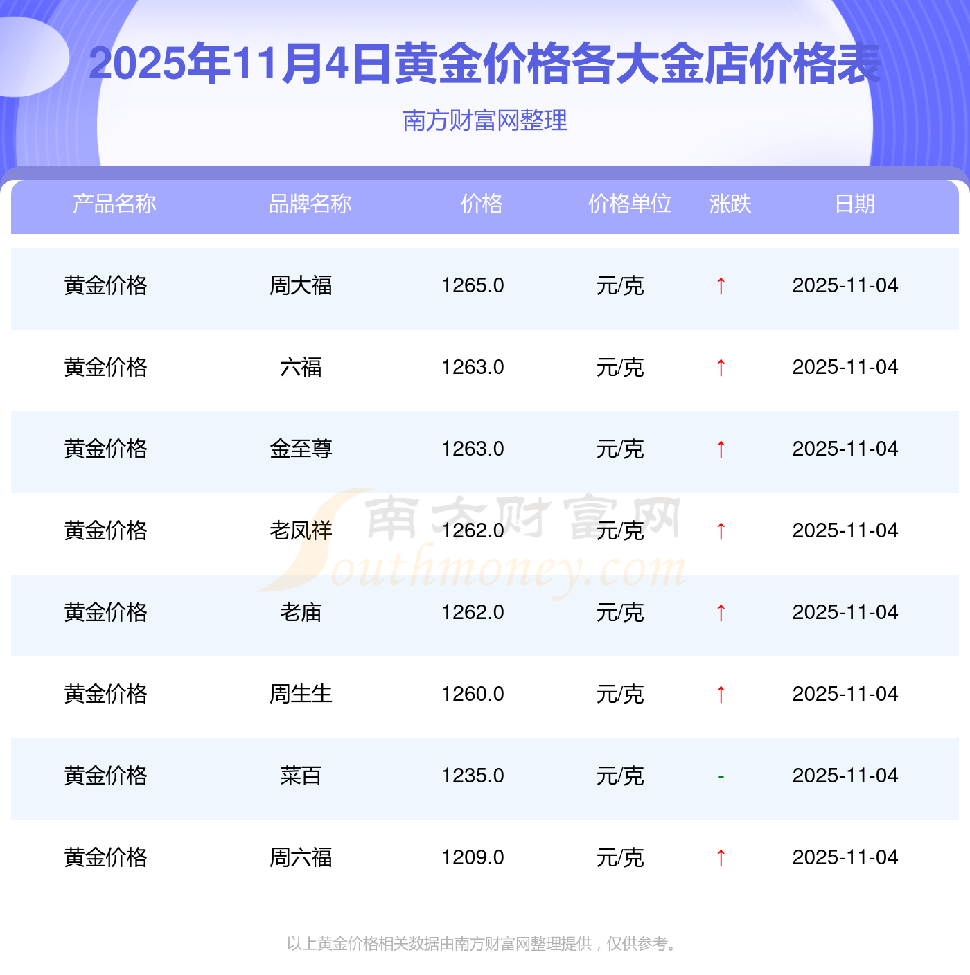 2025年11月4日各大金店黄金价格最新价格:周大福1265.0元/克,周大福633.0元/克,周大福1265.0元/克,周大福44220.0,周大福18130.0,周大福39890.0,周大福1168.0元/克,老凤祥1262.0元/克,老凤祥560.0元/克,老凤祥1262.0元/克,周六福1209.0元/克。