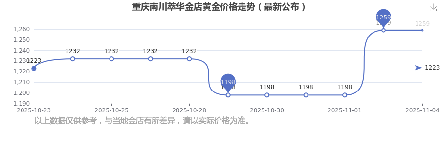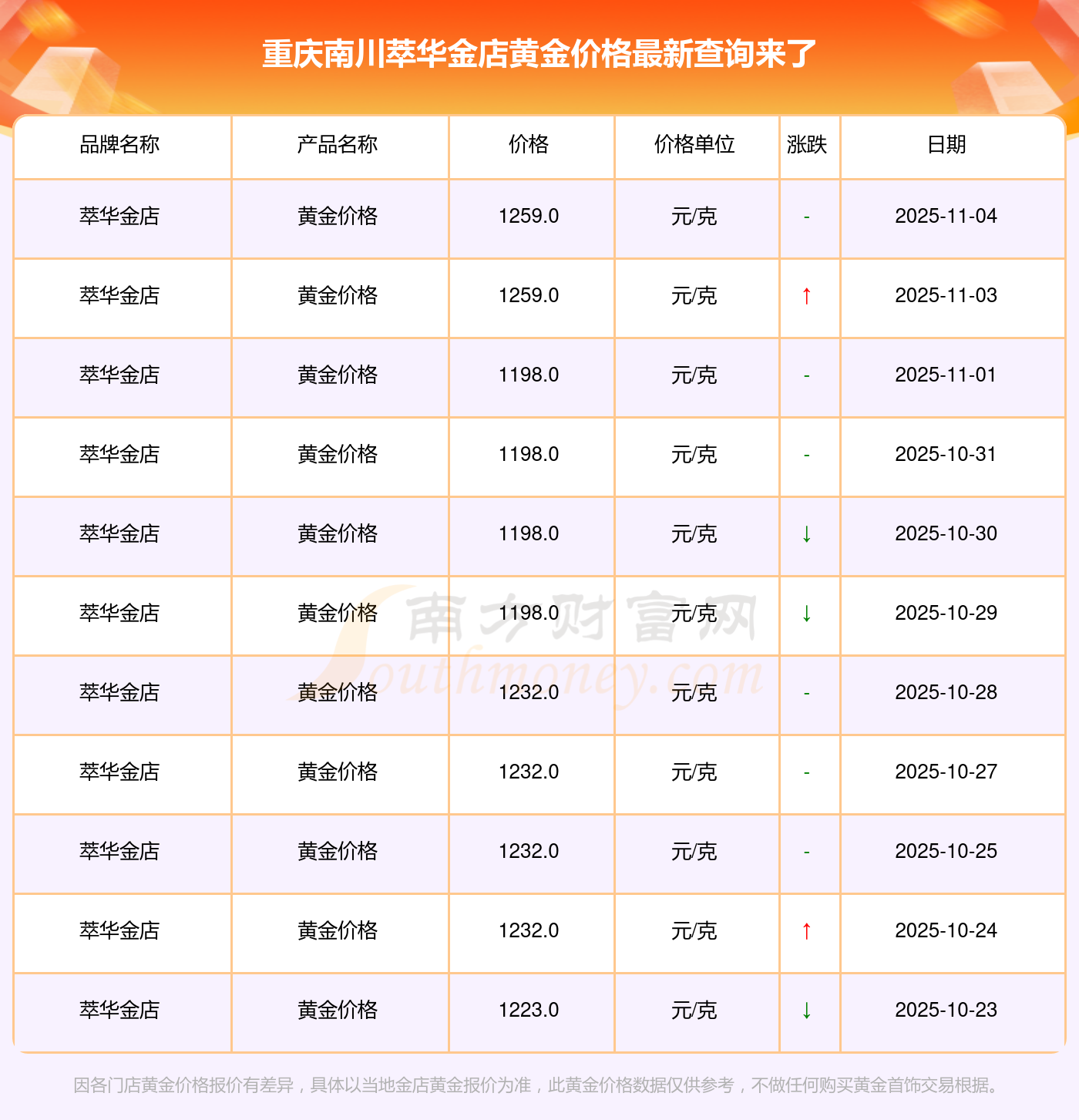 2025年11月4日这一天,重庆南川萃华金店的黄金价格以 1259.0元/克的价格售卖。
