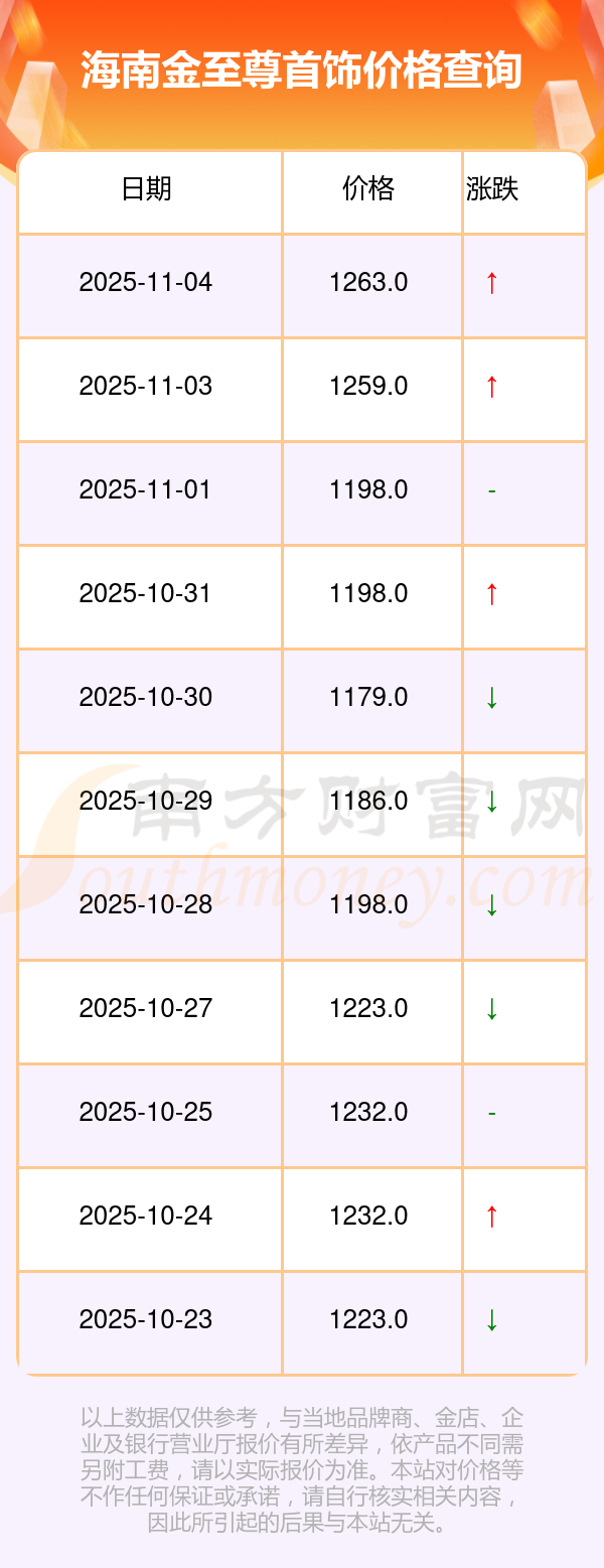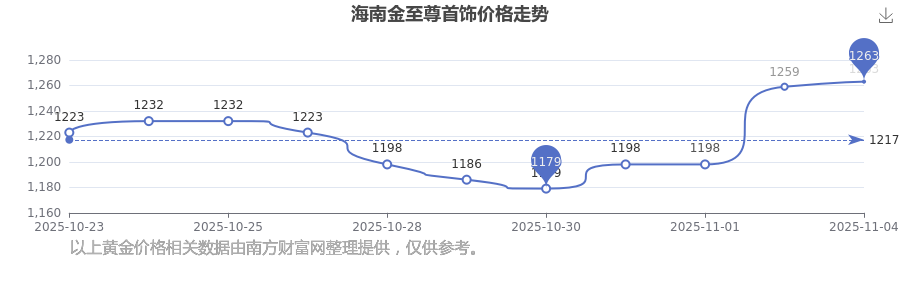 今日(2025年11月4日),海南金至尊首饰的定价为 1263.0元/克。