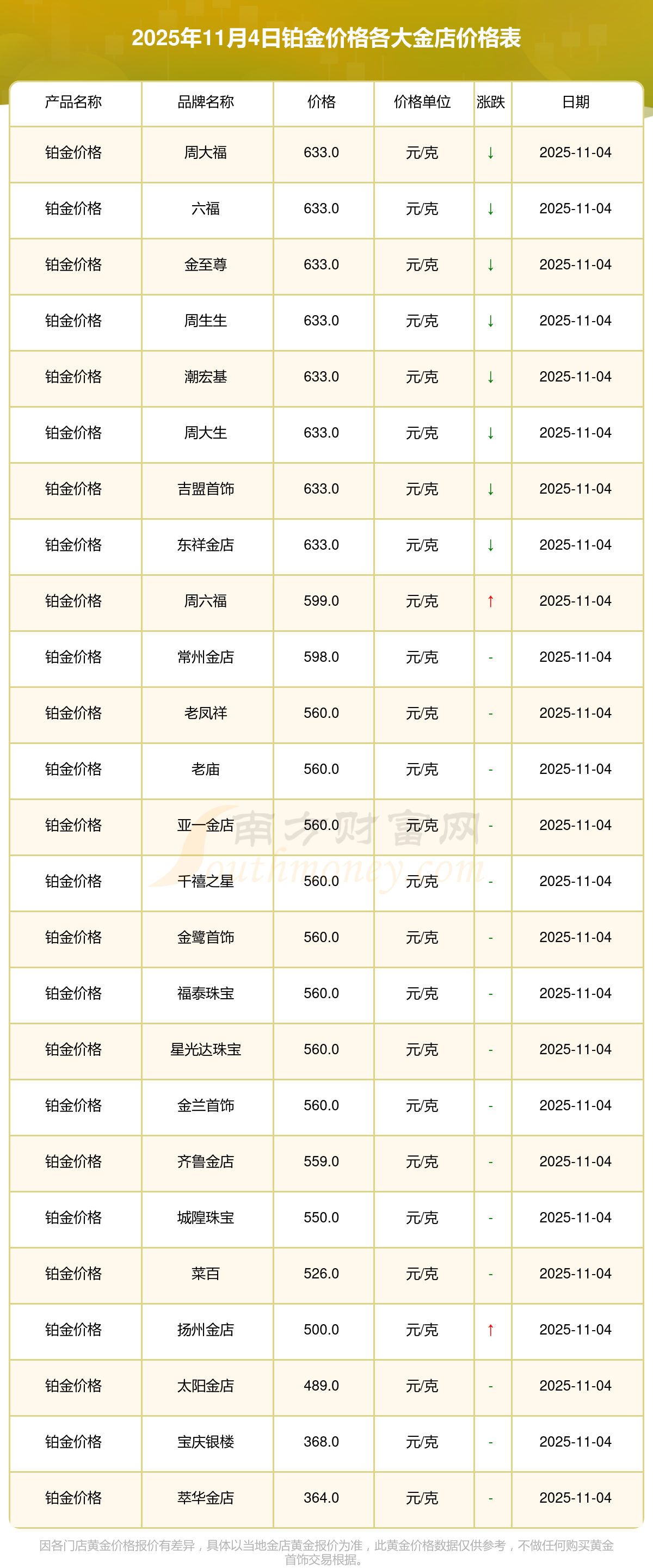 2025年11月4日,周大福、周大福、周大福、周大福、周大福、周大福、周大福、老凤祥、老凤祥、老凤祥、周六福等各大金店品牌铂金价格今日价格如下:周大福1265.0元/克、周大福633.0元/克、周大福1265.0元/克、周大福44220.0、周大福18130.0、周大福39890.0、周大福1168.0元/克、老凤祥1262.0元/克、老凤祥560.0元/克、老凤祥1262.0元/克、周六福1209.0元/克。