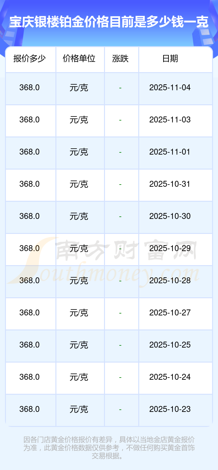 2025年11月4日宝庆银楼铂金价格最新为368.0元/克。