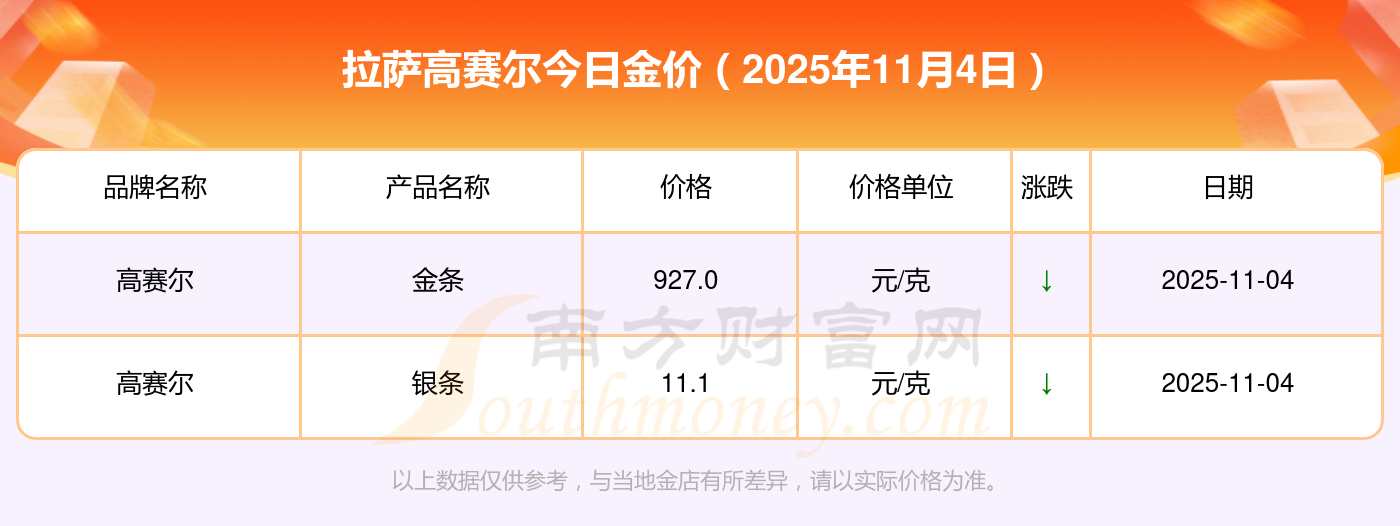 2025年11月4日拉萨高赛尔今日价格:黄金价格1265.0元/克,铂金价格633.0元/克,饰品金价(内地)1265.0元/克,黄金饰品(香港)44220.0,铂金价格(香港)18130.0,金条价格(香港)39890.0,金条金价(内地)1168.0元/克,黄金价格1262.0元/克,铂金价格560.0元/克,足金价格1262.0元/克,黄金价格1209.0元/克。