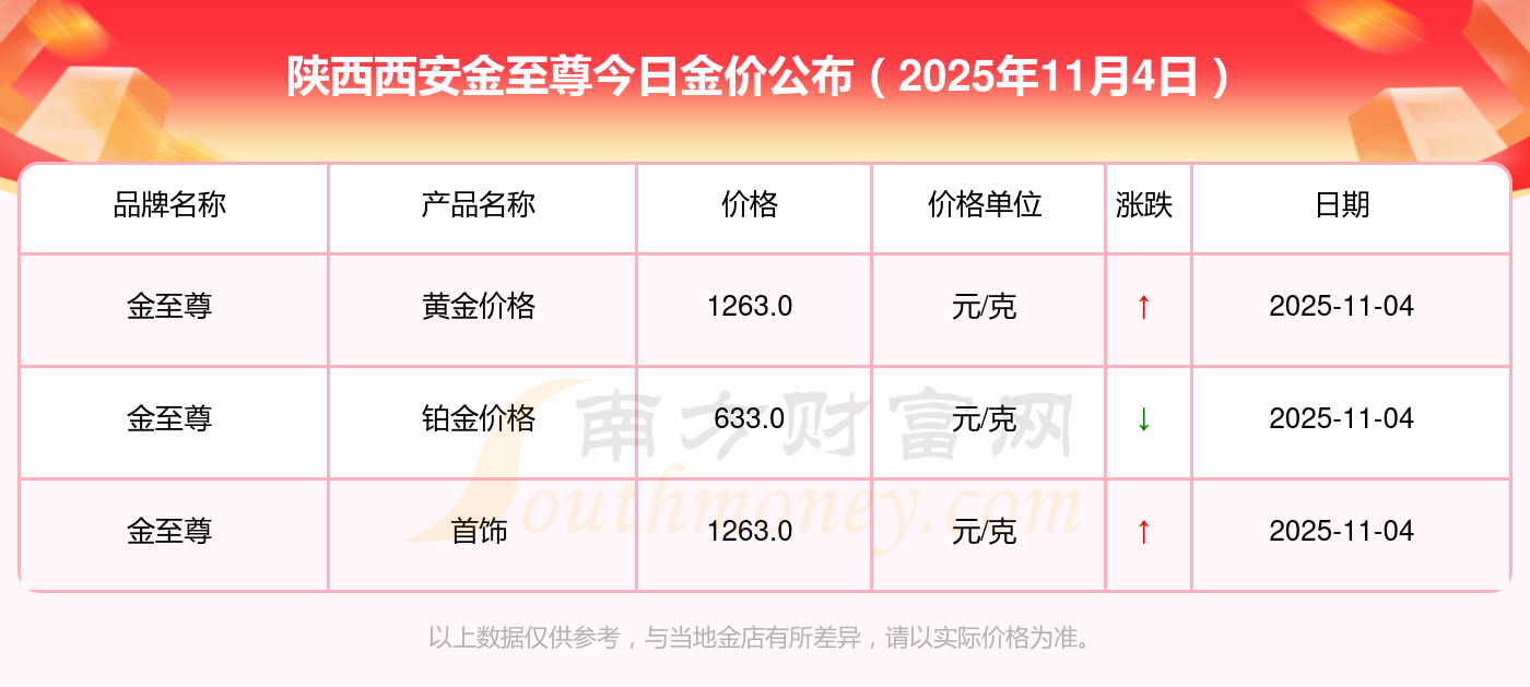 2025年11月4日陕西西安金至尊黄金一克的市场行情价是多少?黄金价格1265.0元/克,铂金价格633.0元/克,饰品金价(内地)1265.0元/克,黄金饰品(香港)44220.0,铂金价格(香港)18130.0,金条价格(香港)39890.0,金条金价(内地)1168.0元/克,黄金价格1262.0元/克,铂金价格560.0元/克,足金价格1262.0元/克,黄金价格1209.0元/克。