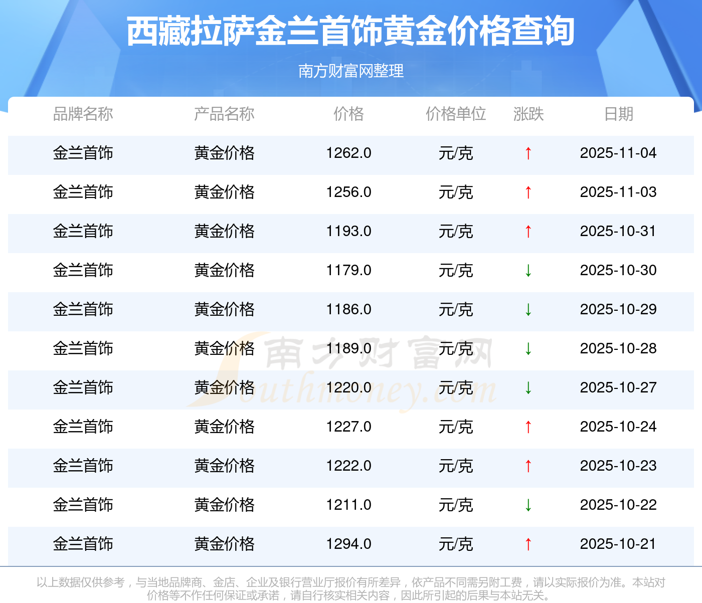 1262.0元/克,这是西藏拉萨金兰首饰于 2025年11月4日所定的黄金价格。