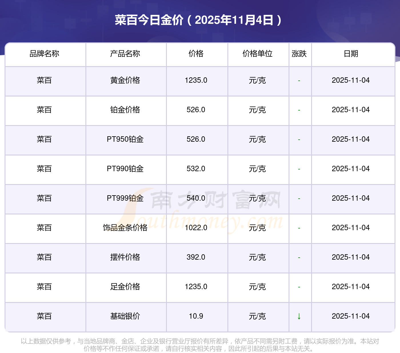 现在菜百黄金价格是多少钱1克_2025年菜百今日金价是多少钱一克,最新菜百查询,2025年11月4日菜百PT990铂金现在每克多少钱?最新菜百PT990铂金报价公布,一起来看看吧!