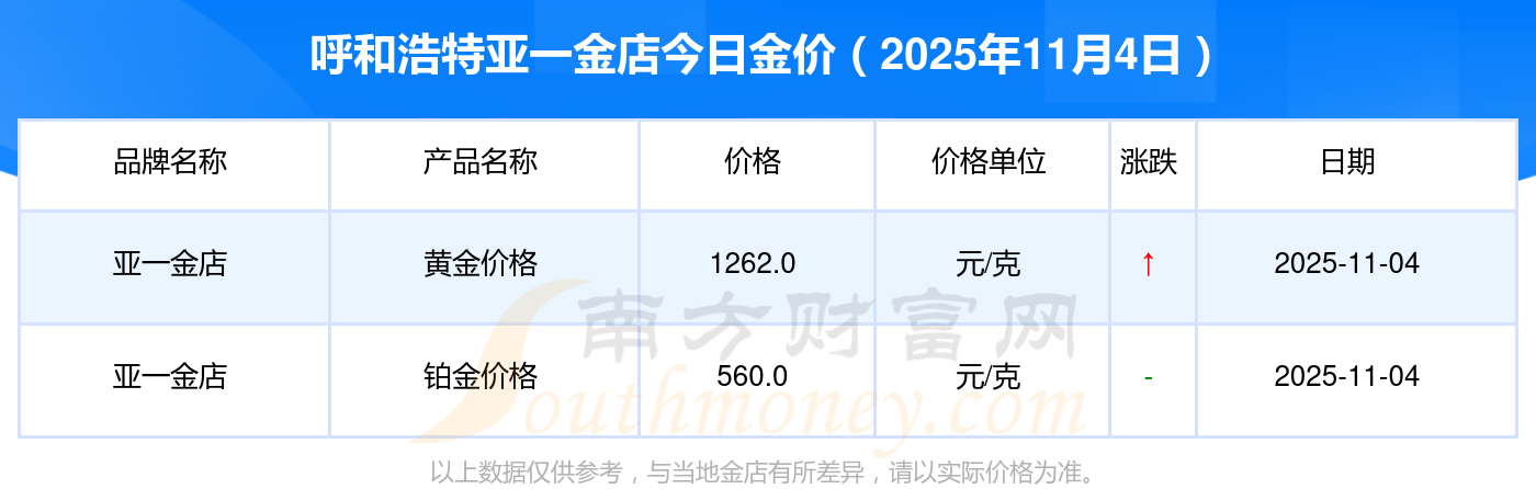 2025年11月4日呼和浩特亚一金店今日价格:黄金价格1265.0元/克,铂金价格633.0元/克,饰品金价(内地)1265.0元/克,黄金饰品(香港)44220.0,铂金价格(香港)18130.0,金条价格(香港)39890.0,金条金价(内地)1168.0元/克,黄金价格1262.0元/克,铂金价格560.0元/克,足金价格1262.0元/克,黄金价格1209.0元/克。