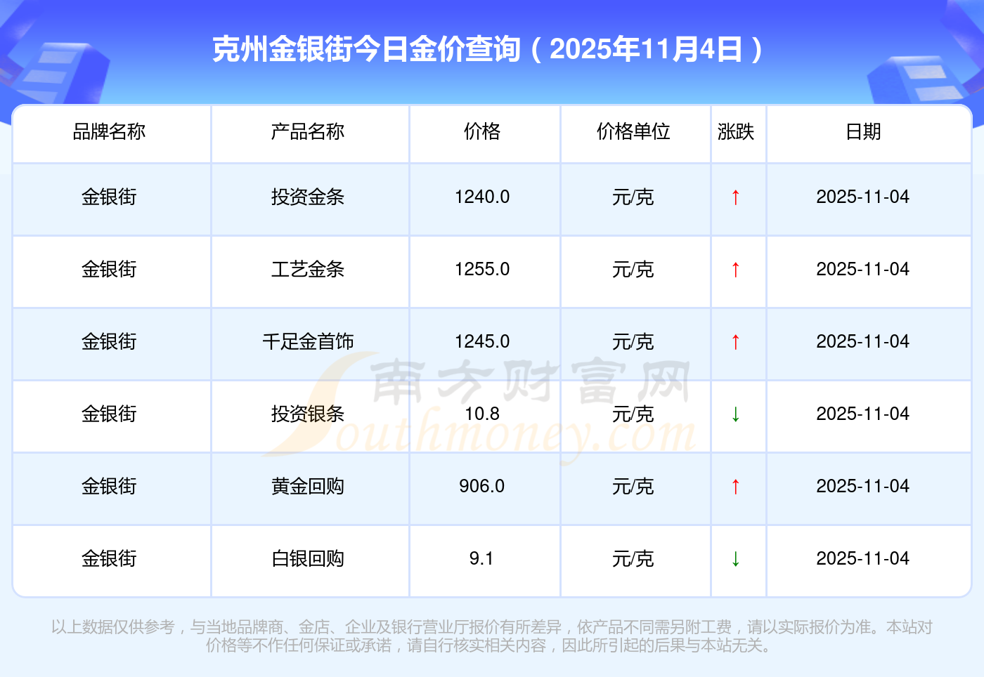 以上数据仅供参考,与当地品牌商、金店、企业及银行营业厅报价有所差异,依产品不同需另附工费,请以实际报价为准。本站对价格等不作任何保证或承诺,请自行核实相关内容,因此所引起的后果与本站无关。