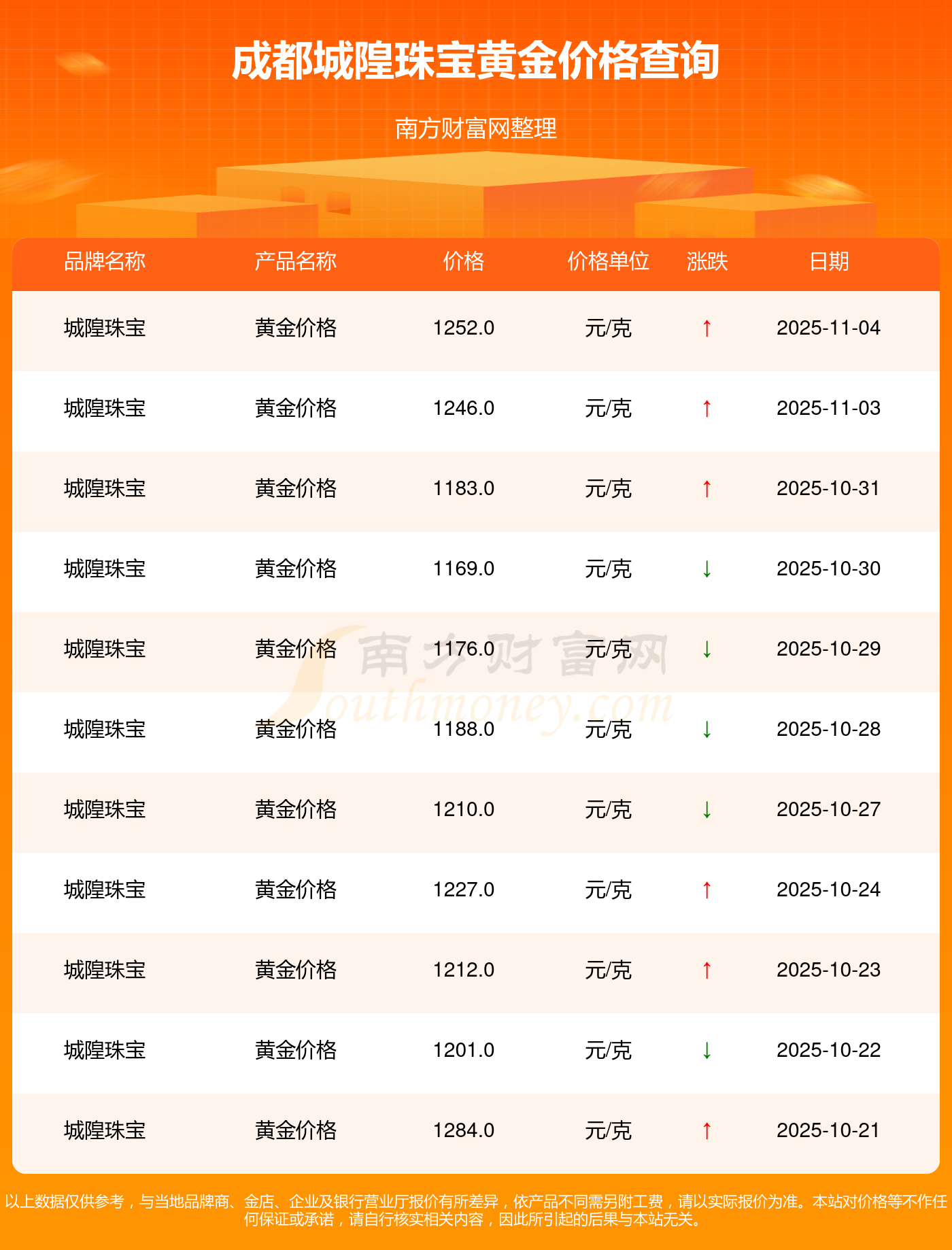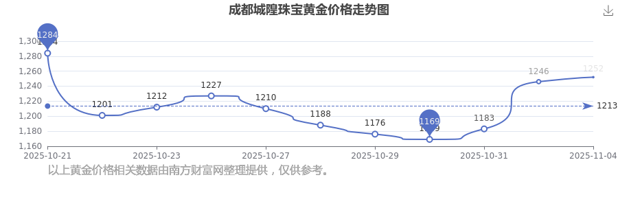 (2025年11月4日)成都城隍珠宝黄金价格现在为1252.0元/克。