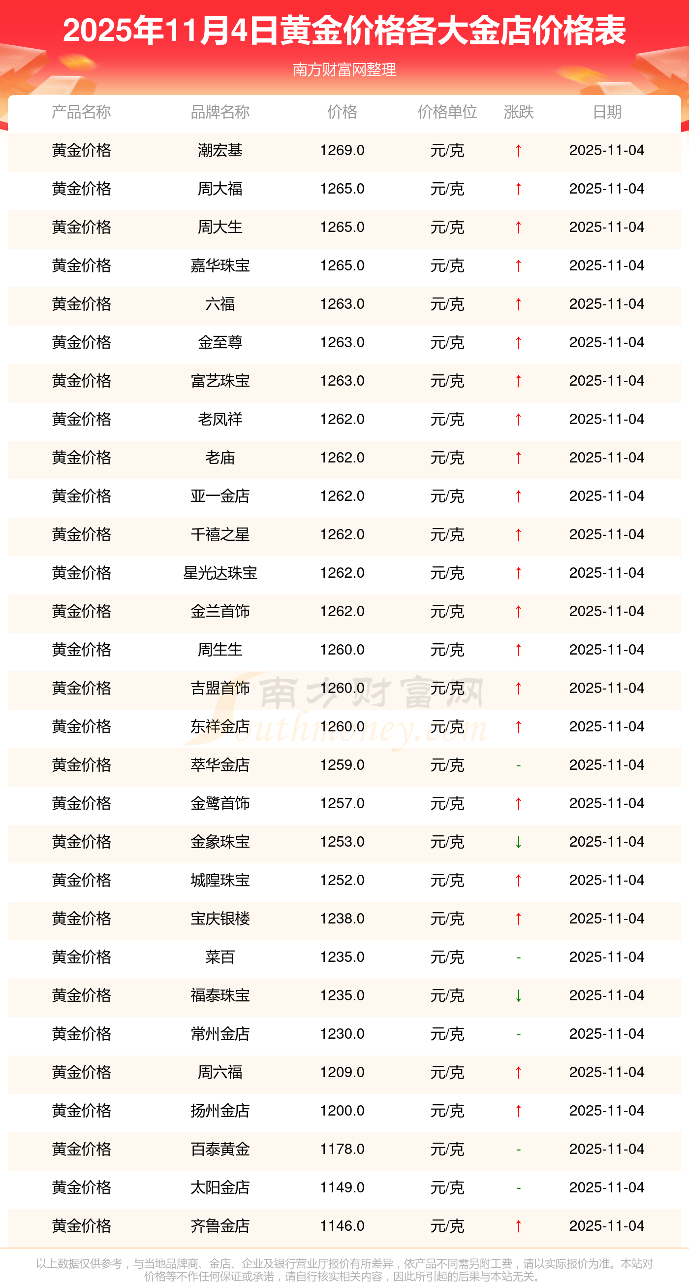 2025年11月4日各大金店黄金价格最新价格:周大福1265.0元/克,周大福633.0元/克,周大福1265.0元/克,周大福44220.0,周大福18130.0,周大福39890.0,周大福1168.0元/克,老凤祥1262.0元/克,老凤祥560.0元/克,老凤祥1262.0元/克,周六福1209.0元/克。