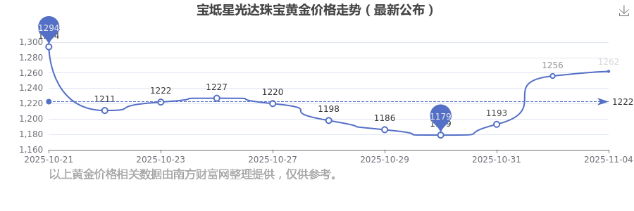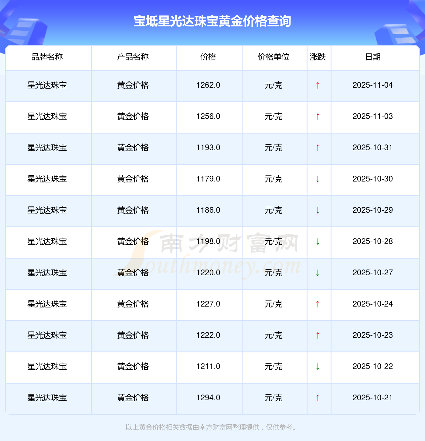 今日(2025年11月4日)宝坻星光达珠宝黄金价格最新价格为1262.0元/克。