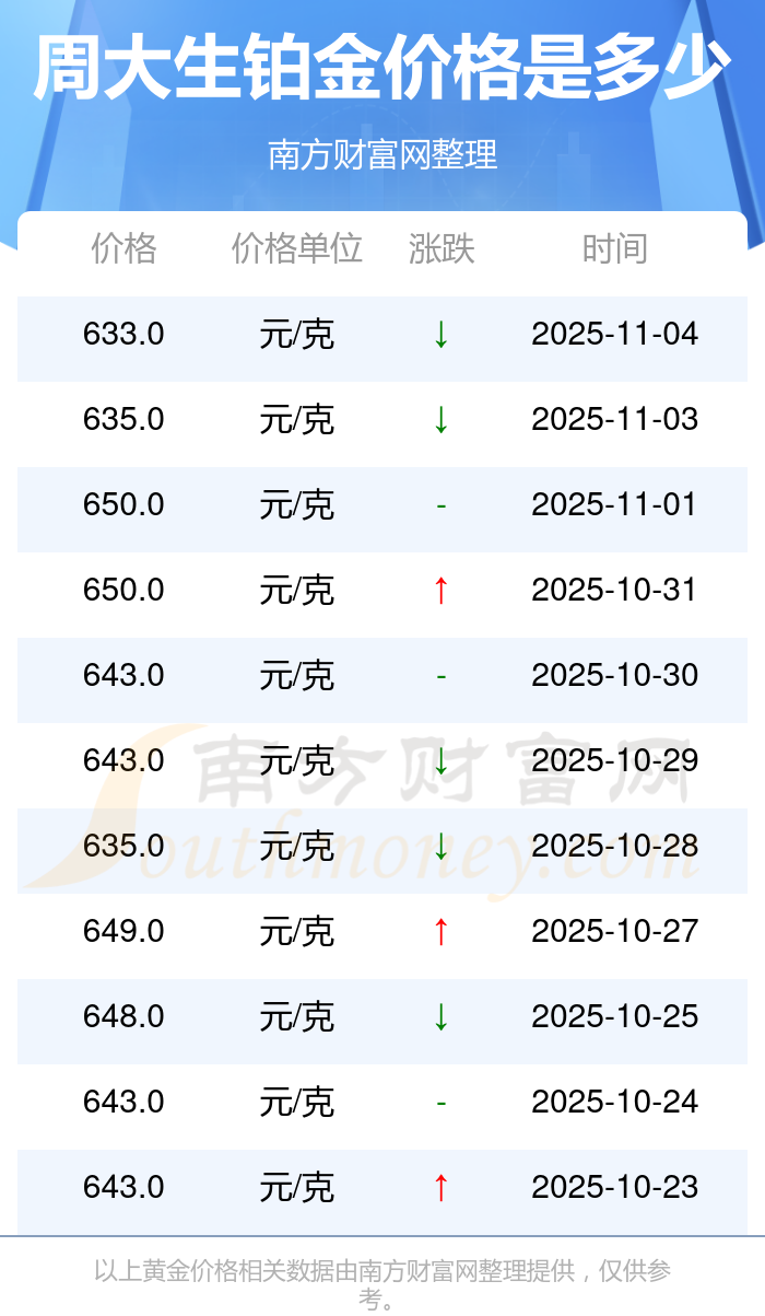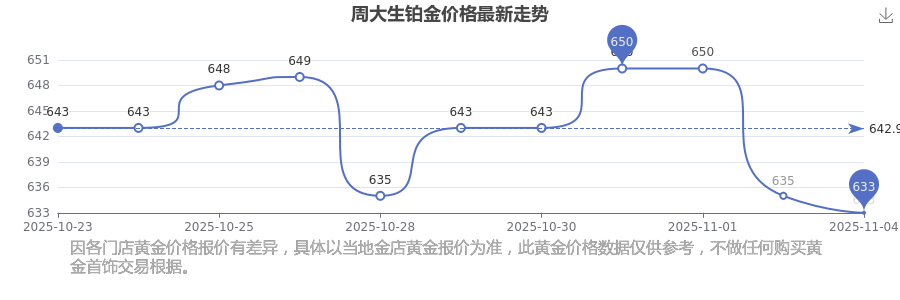 周大生今日 铂金价格的最新市场行情价为633.0元/克。