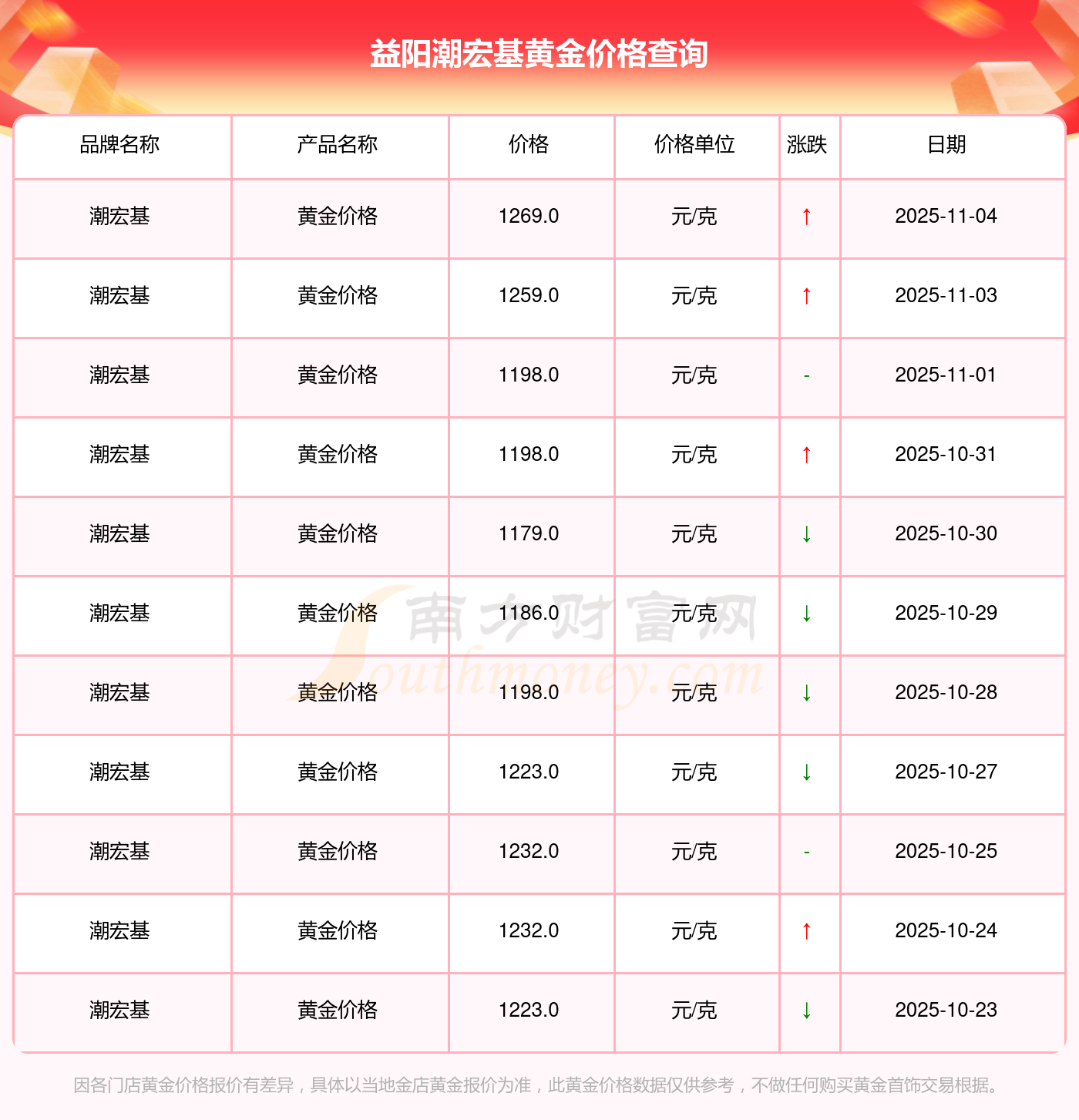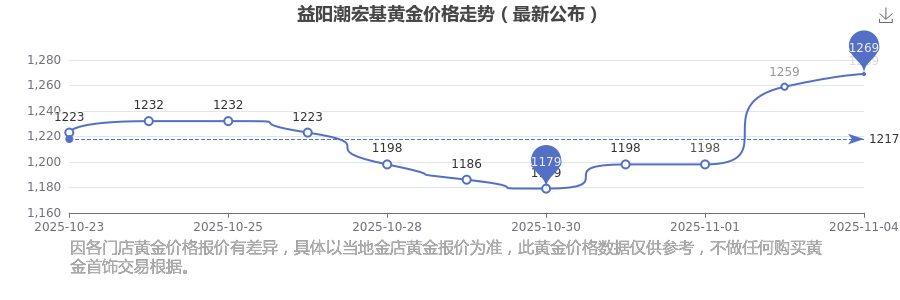 今日(2025年11月4日)益阳潮宏基黄金价格最新价格为1269.0元/克。
