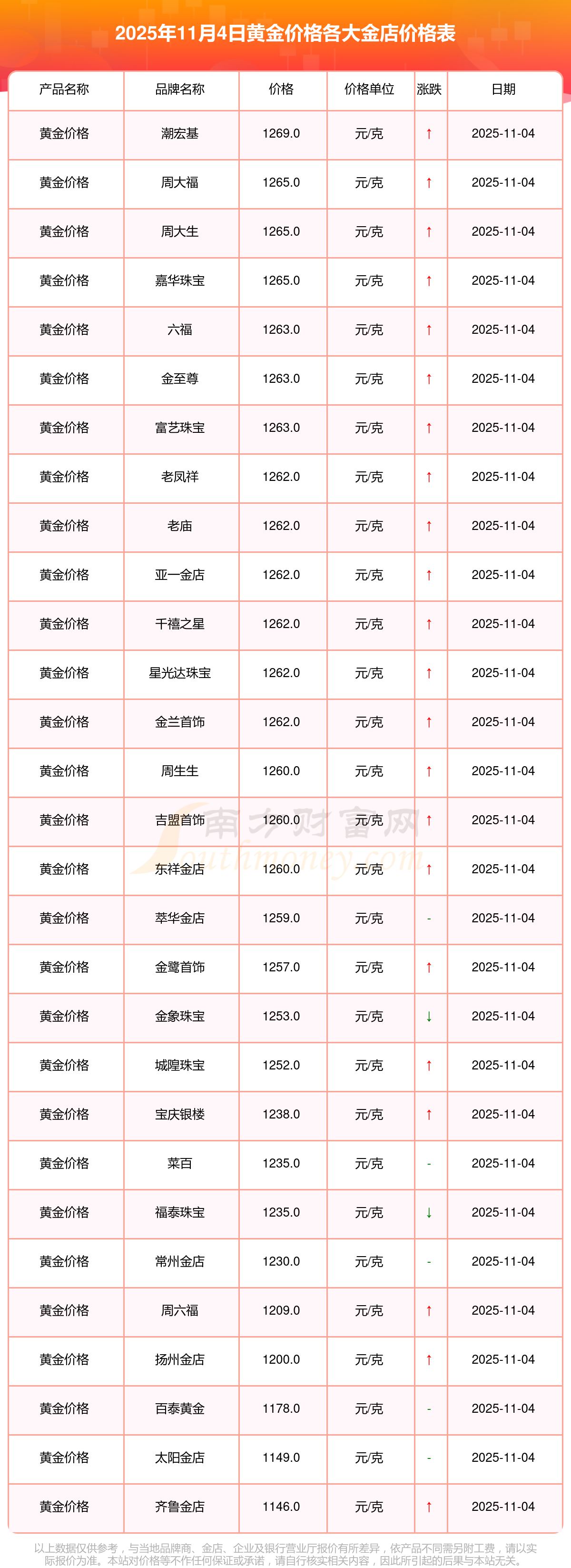 2025年11月4日周大福、周大福、周大福、周大福、周大福、周大福、周大福、老凤祥、老凤祥、老凤祥、周六福等各大金店品牌黄金价格最新价格如下:周大福黄金价格1265.0元/克,周大福铂金价格633.0元/克,周大福饰品金价(内地)1265.0元/克,周大福黄金饰品(香港)44220.0,周大福铂金价格(香港)18130.0,周大福金条价格(香港)39890.0,周大福金条金价(内地)1168.0元/克,老凤祥黄金价格1262.0元/克,老凤祥铂金价格560.0元/克,老凤祥足金价格1262.0元/克,周六福黄金价格1209.0元/克。