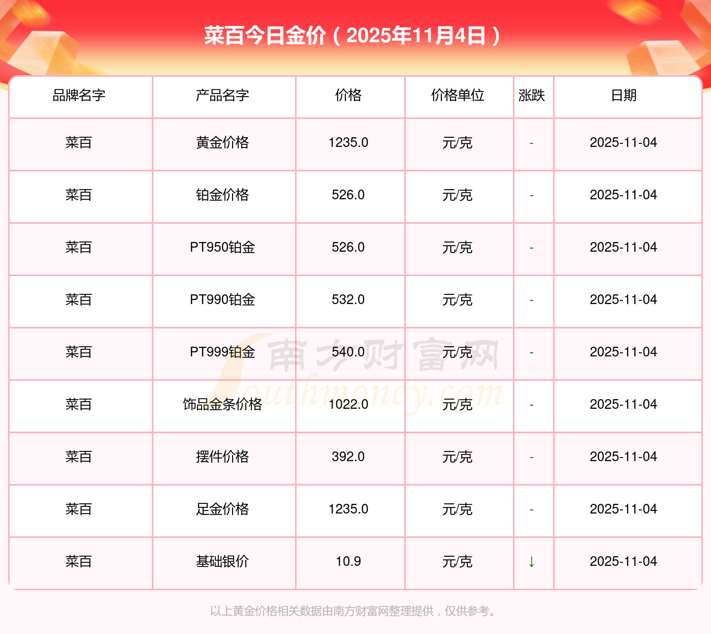 现在菜百黄金价格是多少钱1克_2025年菜百今日金价是多少钱一克,最新菜百查询,2025年11月4日菜百饰品金条价格现在每克多少钱?最新菜百饰品金条价格报价公布,一起来看看吧!