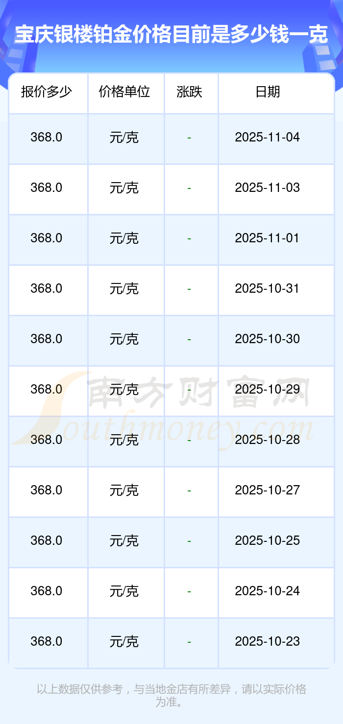 宝庆银楼今日铂金价格的最新市场行情价为368.0元/克。