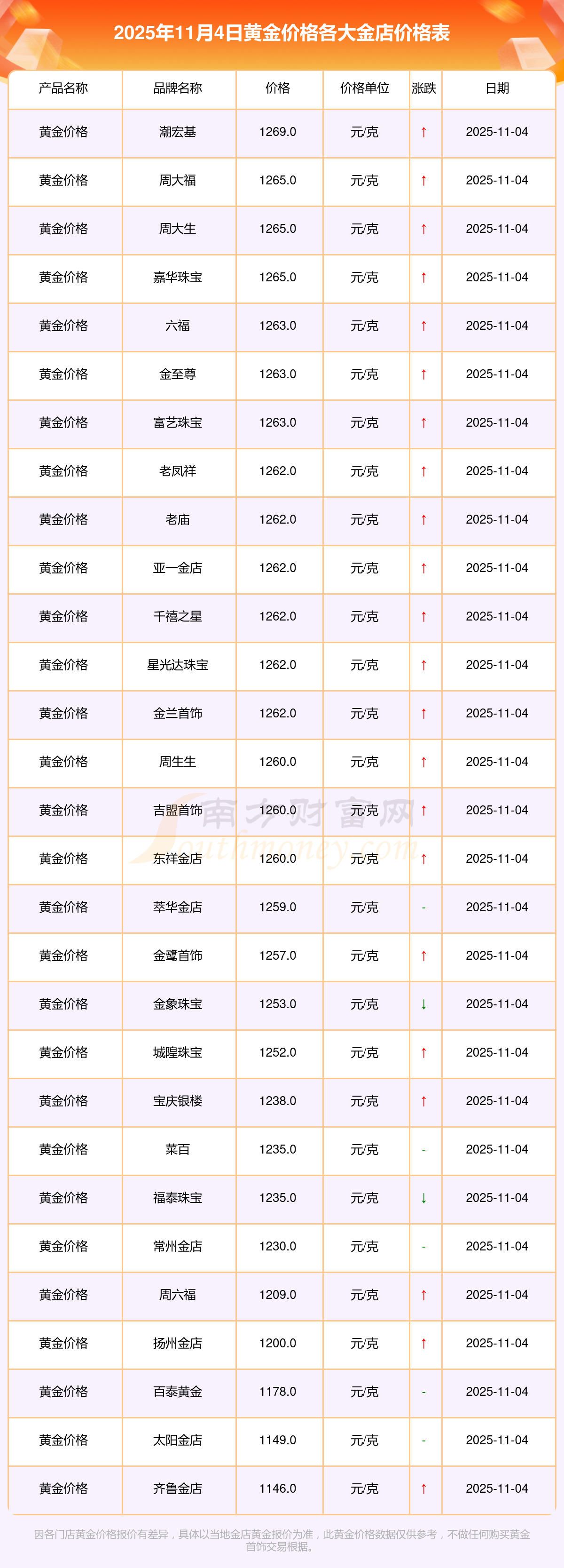 2025年11月4日周大福、周大福、周大福、周大福、周大福、周大福、周大福、老凤祥、老凤祥、老凤祥、周六福等各大金店品牌黄金价格最新价格如下:周大福黄金价格1265.0元/克,周大福铂金价格633.0元/克,周大福饰品金价(内地)1265.0元/克,周大福黄金饰品(香港)44220.0,周大福铂金价格(香港)18130.0,周大福金条价格(香港)39890.0,周大福金条金价(内地)1168.0元/克,老凤祥黄金价格1262.0元/克,老凤祥铂金价格560.0元/克,老凤祥足金价格1262.0元/克,周六福黄金价格1209.0元/克。