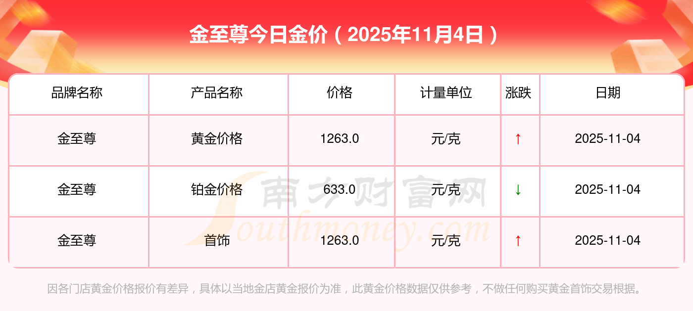 2025年11月4日周大福、周大福、周大福、周大福、周大福、周大福、周大福、老凤祥、老凤祥、老凤祥、周六福等各大金店品牌黄金价格最新价格如下:周大福黄金价格1265.0元/克,周大福铂金价格633.0元/克,周大福饰品金价(内地)1265.0元/克,周大福黄金饰品(香港)44220.0,周大福铂金价格(香港)18130.0,周大福金条价格(香港)39890.0,周大福金条金价(内地)1168.0元/克,老凤祥黄金价格1262.0元/克,老凤祥铂金价格560.0元/克,老凤祥足金价格1262.0元/克,周六福黄金价格1209.0元/克。